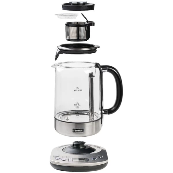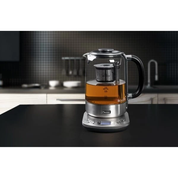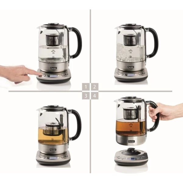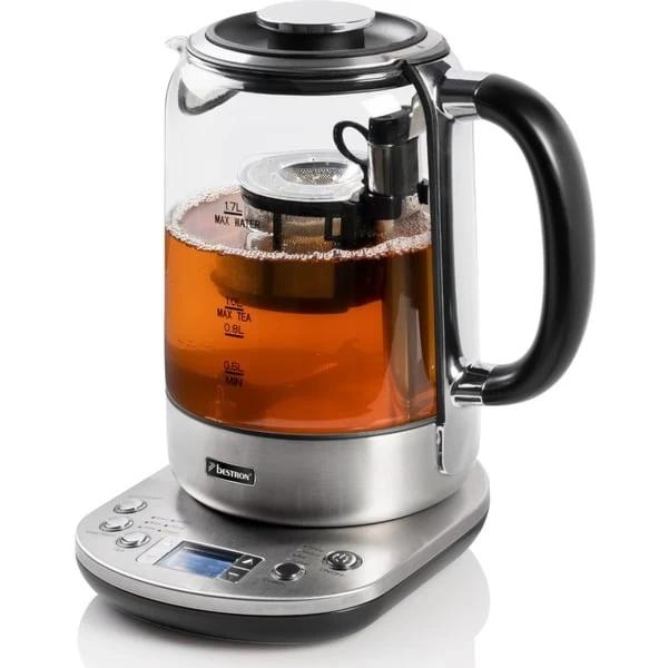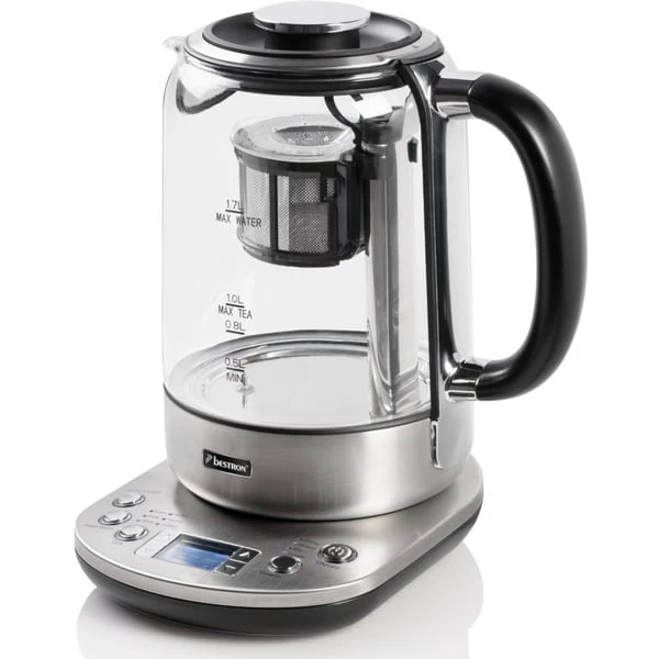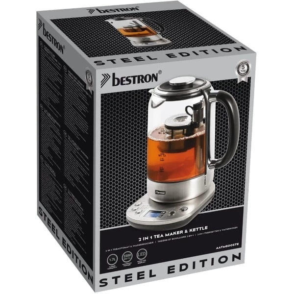 Der AATM800STE 2-in-1 Teebereiter & Wasserkocher aus der Steel Edition von Bestron hat ein Fassungsvermögen von 1,7 Liter Wasser oder 1,0 Liter Tee. Der 2-in-1-Teebereiter & Wasserkocher kann mit losen Tee oder Teebeuteln verwendet werden. Das System verfügt über 5 voreingestellte Teeprogramme, einen Autostart und eine Warmhaltefunktion mit 3 einstellbaren Teestärken. Über das digitale LCD-Bedienfeld lassen sich auch persönliche Einstellungen vornehmen. Der Teekorb sinkt bei Erreichen der Temperatur automatisch in das kochende Wasser. Dank rutschfester Füße, integrierter Kochstopp-Automatik sowie Trockengeh- und Überhitzungsschutz ist der AATM800STE auch in puncto Sicherheit eine gute Wahl. Der herausnehmbare Antikalkfilter schützt vor Kalkablagerungen und erleichtert die Reinigung.Art.-Nr.: 1740967