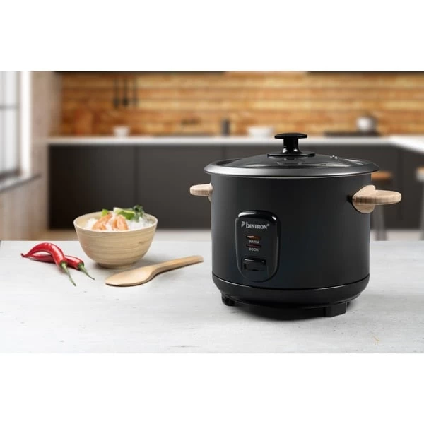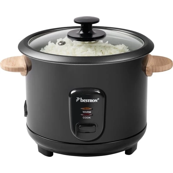 Der Reiskocher ARC100BW von Bestron kocht schnell und vollautomatisch alle Sorten Reis sowie Natur, Basmati, Risotto, Wild, Sushi Reis etc. Mit 1 Liter Volumen können bis zu 750 g Reis zubereitet werden, das reicht für vier bis acht Personen. Die Warmhaltefunktion hält den Reis nach dem Kochen für längere Zeit auf der perfekten Temperatur. Über den Glasdeckel mit Dampfaustrittsöffnung hat man den Reis immer im Blick. Der Innentopf mit Messskala ist zur einfachen Reinigung herausnehmbar und mit einer spülmaschinenfesten Antihaftbeschichtung ausgestattet. Die Bedienung erfolgt ganz einfach über einen Ein-/Aus-Schalter. Es gibt jeweils eine Kontrollleuchte zum Kochen und zum Warmhalten.