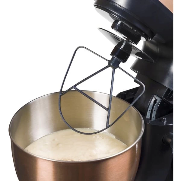 Die Küchenmaschine AKM900CO aus der Copper Collection von Bestron im stilvollen Kupfer-Design ist mit 1.000 Watt eine sehr leistungsstarke Küchenmaschine. Die Rührschüssel sowie Schneebesen, Rührer und Knethaken bestehen aus Edelstahl. Mit 7 Geschwindigkeitsstufen und Pulsfunktion eignet sie sich zum Kneten von Teigen, Aufschlagen von Sahne oder Eiweiß oder zum Rühren von verschiedenen Zutaten oder Teig etc. Die Schüssel hat eine Kapazität von 500g Brotteig oder bis zu 2,5 Liter Rührteig. Dank des Spritzschutz-Deckels mit Einfüllöffnung bleibt die Arbeitsfläche während dem Betrieb sauber. Der Liftmechanismus erleichtert die Handhabung und das Wechseln der Zubehörteile. Rutschfeste Gumminoppen am Boden sorgen für einen festen Stand. Art.-Nr.: 1636590