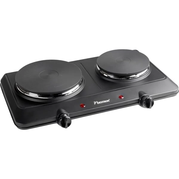 Die Doppelkochplatte AHP250D von Bestron ist mit bietet zwei Platten mit 1500 Watt und 750 Watt Leistung. Das Gehäuse ist hoch hitzebeständig lackiert. Die größere der Gusseisenplatten hat einen Durchmesser von ca. 18 cm und die kleinere einen Durchmesser von ca. 15 cm. Über das jeweilige Thermostat kann die Temperatur der einzelnen Platte stufenlos eingestellt werden. Für Sicherheit sorgen die Kontrollleuchte und die Antirutschfüße.