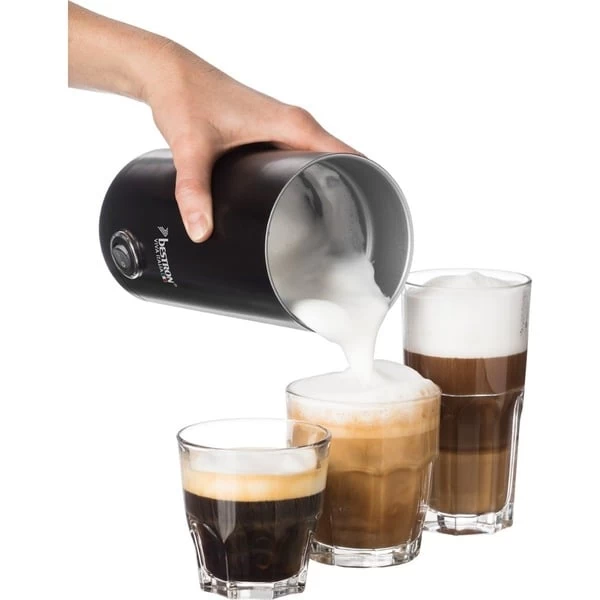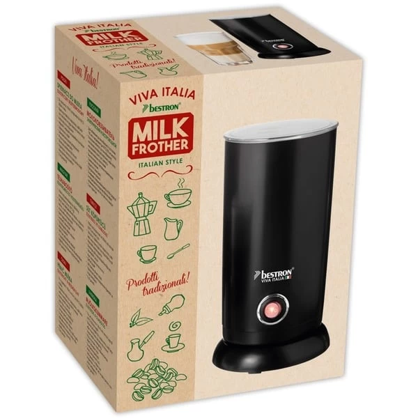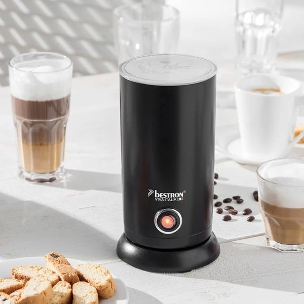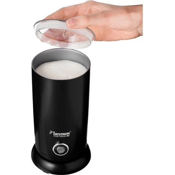Der Milchaufschäumer AMF8050 von Bestron überzeugt mit 450 – 550 Watt Leistung. In dem Metallbehälter lassen sich 190 ml Milch aufschäumen oder bis zu 300 ml auf 65°C erwärmen. Besonders praktisch ist der 360°-Anschlusssockel des AMF8050 denn so lässt sich der Behälter in jeder Position aufstellen und wieder in Betrieb nehmen. Der transparente Deckel erlaubt den Blick ins Innere und ist abnehmbar. Die Bedienung ist dank des Ein-/Ausschalters mit Kontrollleuchte sehr einfach. Dank der Antihaftbeschichtung lässt sich der Behälter hygienisch und leicht reinigen.Art.-Nr.: 1534830