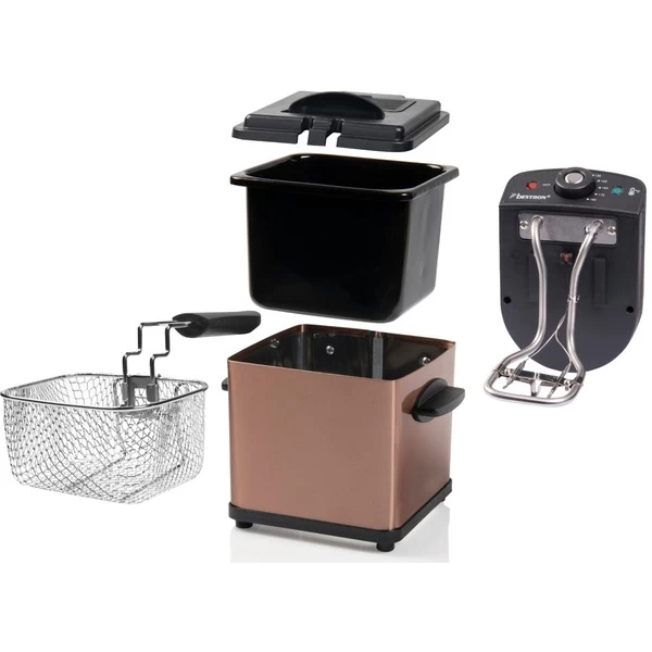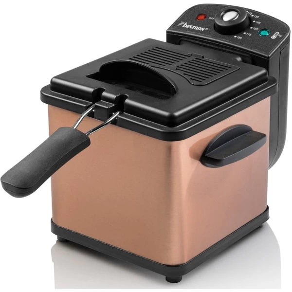 Die Bestron Mini Fritteuse AF100CO mit Kaltzonen-Technik aus der Serie Copper Collection ist in stilvollem Kupfer-Design gehalten. Das Frittierfett ist wegen Kaltzonen-Technik länger haltbar, denn herabsinkende Frittierreste verbrennen nicht am Boden. Sie eignet sich ideal zum Frittieren von Pommes Frites, Snacks, Fisch und vielem mehr. Der herausnehmbare emaillierter Behälter fasst ca. 1,5 Liter Öl und reicht für ca. 150 Gramm Pommes Frites aus. Die Temperatur lässt sich bis 190ºC regeln. Der doppelt isolierte Spritzschutzdeckel mit Sichtfenster und auswechselbarem Fettfilter hält die Arbeitsplatte sauber. Die Bestron Mini Fritteuse AF100CO ist vollständig auseinandernehmbar, alle Teile außer dem Heizelement sind spülmaschinengeeignet. Sie ist außerdem mit einer Ein/Aus-Kontrollleuchte, einer Temperatur-Kontrollleuchte, Überhitzungsschutz, wärmeisolierten Griffen und Antirutschfüßen ausgestattet.Art.-Nr.: 1915095