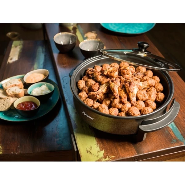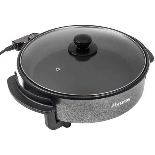 Mit der Multifunktions-Party- /Snackpfanne AHP1200 von Bestron lassen sich Speisen braten, backen oder warmhalten. Mit dem extra hohen Rand ist sie perfekt geeignet für Frikadellen, Nudeln, Paella, Chili con Carne, oder aber auch Pizza. Die Temperatur lässt sich stufenlos über einen abnehmbaren Drehschalter mit Thermostat und Kontrollleuchte einstellen. Durch die Anithaftbeschichtung wird weniger Fett benötigt und die Reinigung vereinfacht. Der Glasdeckel mit Dampfventil ist spülmaschinengeeignet. Die wärmeisolierten Griffe und die Antirutschfüße sorgen für Sicherheit. Ein farbiges Booklet mit vielseitigen Serviervorschlägen ist im Lieferumfang enthalten.Art.-Nr.: 1535970