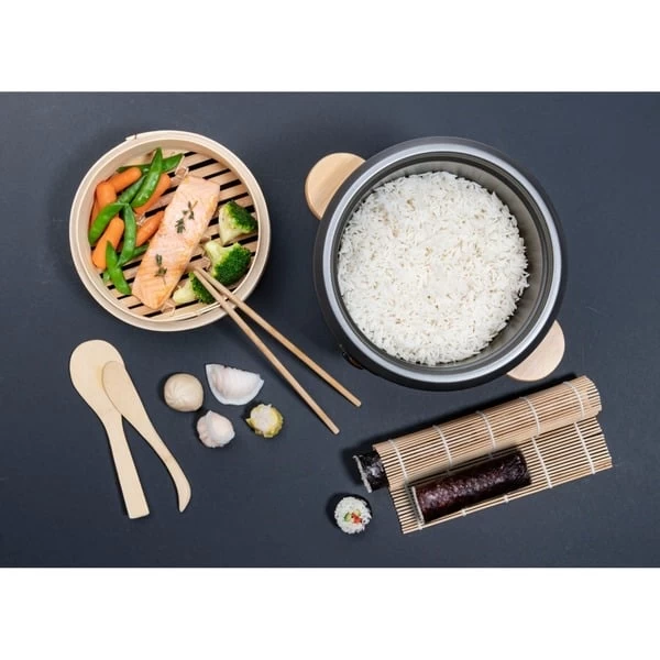 | Zubehör | vorhanden | Bambus Dampfkorb, Glasdeckel mit Bambusgriff, 5-teiliges Sushi-Maker-Set (2x Stäbchen, Bambus-Rolle, 1x kleiner Löffel, 1x großer Löffel, 1x Messbecher) | |