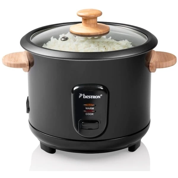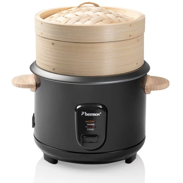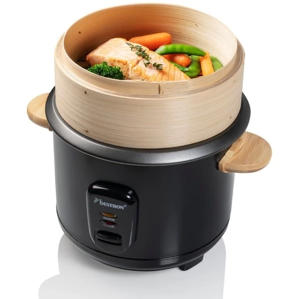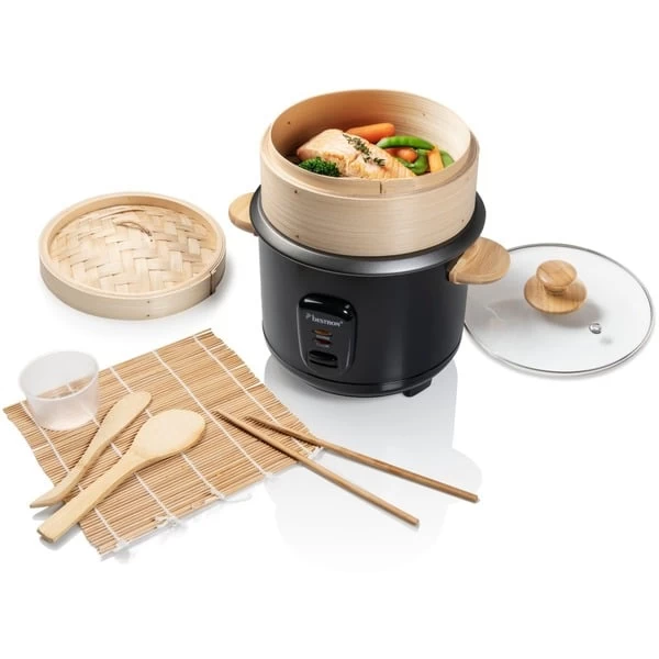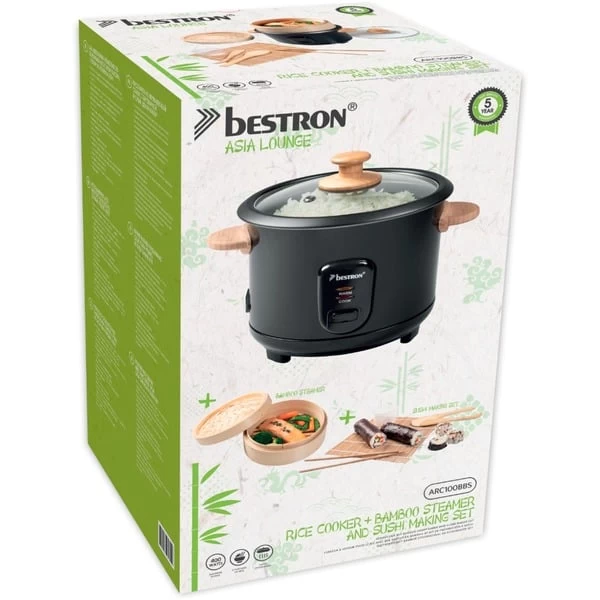 Der Bestron ARC100BBS ist ein vollautomatischer Reiskocher für vier bis sechs Personen. Er kocht schnell und vollautomatisch alle Sorten Reis wie Natur-, Basmati-, Risotto-, Wild-, Sushi-Reis und mehr. Mit dem extra Bambus Dampfkorb (Ø 19cm) lassen sich Teigtaschen, Gemüse, Fisch oder Fleisch schonend garen. Das fünfteilige Sushi-Maker-Set enthält zwei Stäbchen, eine Bambus-Rolle, einen kleinen und einen großen Löffel sowie einen Messbecher. Der ARC100BBS hat eine maximale Kapazität von 750g Reis, das entspricht ca. 5 Tassen. Die Warmhaltefunktion hält den Reis für längere Zeit auf der perfekten Temperatur. Für Sicherheit sorgen zwei Kontrollleuchten zum Kochen und zum Warmhalten. Die Bedienung ist sehr einfach und die automatische Abschaltung macht die Nutzung noch bequemer. Durch den Glasdeckel mit Dampfaustrittsöffnung hat man den Garvorgang immer im Blick. Die Innenwanne ist antihaftbeschichtet und verfügt über eine Wasserstandanzeige. Zur einfacheren Reinigung ist die herausnehmbare Innenwanne spülmaschinengeeignet.