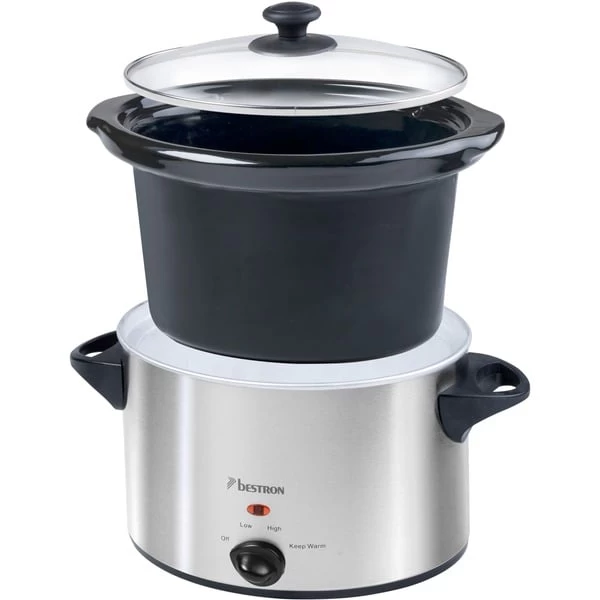 Mit dem Slow Cooker ASC350 von Bestron mit elegantem Edelstahlgehäuse kann man Fleisch, Gemüse, Eintöpfe, Curries, Gulasch, Hähnchen, Chili, Suppen usw. langsam und schonend garen. Das Garen mit Niedrigtemperatur ist gesund und lecker, Vitamine, Geschmack und Nährstoffe bleiben erhalten. Mit nur 180 Watt ist der Slow Cooker sehr sparsam im Verbrauch. Das Fassungsvermögen beträgt 3,5 Liter und ist geeignet für ca. 3-4 Personen. Der ASC350 ist sehr einfach zu bedienen. Das Gerät bietet drei Stufen: Niedrig, Hoch, Warmhalten. Durch den praktischen Glasdeckel kann der Garvorgang jederzeit verfolgt werden. Die herausnehmbare Keramikinnenpfanne eignet sich auch zum Servieren. Der Deckel und die Innenpfanne sind zur einfachen Reinigung spülmaschinengeeignet. Für Sicherheit und einen angenehmen Gebrauch sorgen die hitzebeständigen Griffe, der Überhitzungsschutz und Antirutschfüße. Im Lieferumfang ist ein farbenfrohes Booklet mit Kochtipps enthalten.Art.-Nr.: 1636896