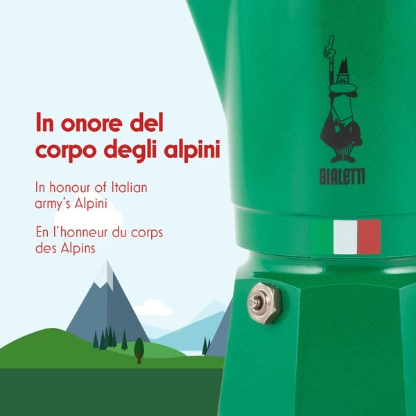 Mit der Break Alpina von Bialetti gelingt die Zubereitung eines traditionellen italienischen Espresso oder Mokka innerhalb von Minuten. Diese Variante der Break kocht bis zu drei Tassen in einem Durchgang und kommt im einzigartigen Design des italienischen Gebirgsjägerkorps daher – der Deckel und die Feder sind dem charakteristischen Hut der Gebirgsjäger nachgebildet. Die Break Alpina ist aus einer Aluminiumlegierung hergestellt, die sowohl auf Gasherd als auch auf Herdplatte verwendet werden kann.Art.-Nr.: 1752132