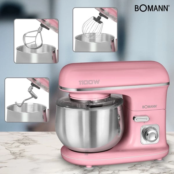 Die kraftvolle Knetmaschine KM 6030 mit leistungsstarken 1.100 Watt ist ideal für die Zubereitung von Rühr- und Knetteigen, auch lockerer Biskuit und luftiger Eischnee ist mit dem Edelstahl-Schneebesen ein Kinderspiel. In der großen 5-Liter-Edelstahlschüssel lassen sich, dank des robusten Spezialgetriebes, Teige bis zu 2,5 kg – 3 kg verarbeiten. Mit dem Alu-Druckguss-Rührhaken lassen sich größere Mengen Teig gleichmäßig verrühren. Für schwere Teige wie Hefe- oder Brotteig ist der Alu-Druckguss-Knethaken optimal geeignet. Die Geschwindigkeit kann stufenlos eingestellt werden. Ein abnehmbarer Spritzschutzdeckel mit Nachfüllöffnung, der um 35° schwenkbare Multifunktionsarm mit Entriegelungsmechanismus und das Schnellspannfutter zum Wechseln der einzelnen Werkzeuge sorgen bei der KM 6030 für weiteren Komfort. Für Sicherheit sorgen die Sicherheitsschaltung sowie die Saugfüße. Art.-Nr.: 1588214