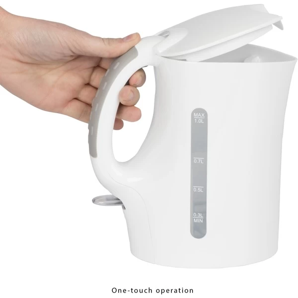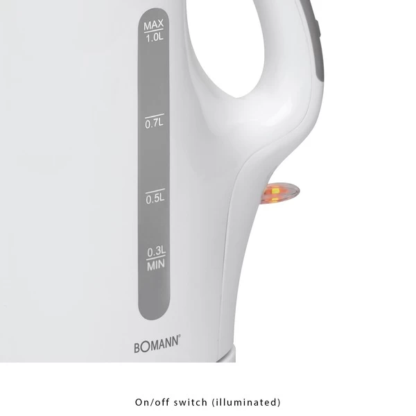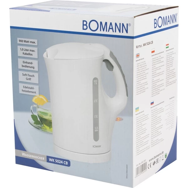 Mit einer Leistung von 900 W bringt der WK 5024 von Bomann das eingefüllte Wasser schnell und effizient zum Kochen, dabei liegt die maximale Füllmenge bei 1 Liter. Der Sicherheits-Klappdeckel kann mit einer Hand geöffnet und befüllt werden, dabei lässt sich die Füllmenge über die außenliegende Anzeige einsehen. Zur besseren Reinigung ist der Kalkfilter herausnehmbar. Für eine hohe Sicherheit sorgen der Trockengeh- und Überhitzungsschutz sowie ein rutschfester, gummierter Griff.Art.-Nr.: 1460491