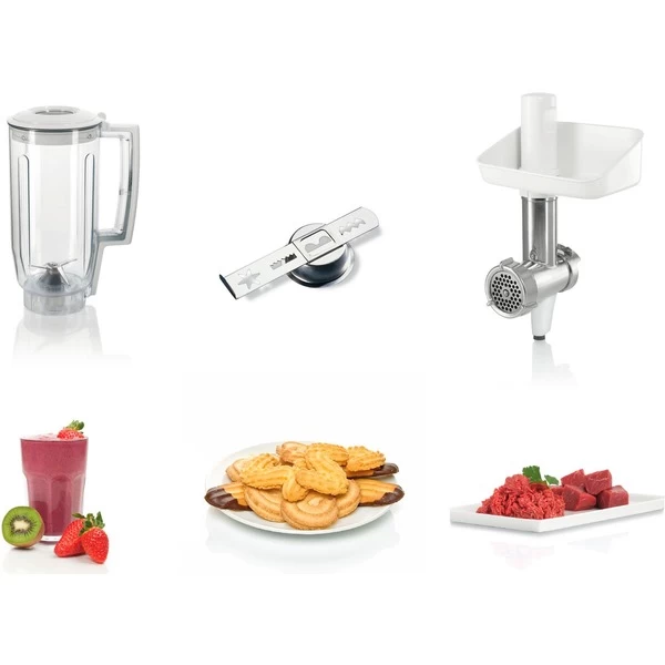 Die Küchenmaschine Bosch MUM54270 ist ein Universaltalent mit sieben Schaltstufen und einer zusätzlichen Momentstufe zum Zerkleinern und Hacken. Durch das vielfältige Zubehör, welches sich in der mitgelieferten Zubehörtasche verstauen lässt, macht Kochen und Backen wieder richtig Spaß. Dank des 3D-Rührsystems „Multi-motion-drive“ nimmt das Gerät einem alle Vorarbeiten ab, vom einfachen Mixen über Teigrühren, bis hin zum Zerkleinern. Die MUM 54270 besitzt eine Edelstahl-Rührschüssel für maximal 2 kg Teig sowie einen Mixer-Aufsatz mit einem Fassungsvermögen von 1,25 Liter. Somit besteht beim nächsten Rührkuchen die Herausforderung nur noch darin, das beste Rezept zu finden. In punkto Sicherheit glänzt die MUM 54270 mit einem Überlastungsschutz und rutschfesten Gummifüßen für einen sicheren Stand auf der Arbeitsfläche.Art.-Nr.: 1195116