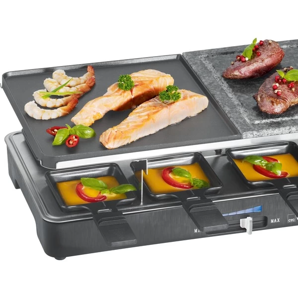 Der 2-in-1 Raclette-Grill RG 3518 von Clatronic bietet Platz für acht Personen und hat eine Leistungsaufnahne von 1200 – 1400 Watt. Enthalten sind acht antihaftbeschichtete Raclette-Pfännchen sowie zwei Grillplatten mit einer Grillfläche von jeweils 23 x 23 cm. Die antihaftbeschichtete Wendegussplatte bietet eine Grillfläche mit glatter Oberfläche zum Grillen von Fisch oder eine Seite mit Rillen für ein intensives Grillmuster bei Fleisch. Mit dem Naturgrillstein lässt sich gesund und fettarm grillen. Die Temperatur kann stufenlos über einen blau beleuchteten Schieberegler eingestellt werden. Die Antihaftbeschichtung, der Wendegussplatte, erleichtert die Entnahme der gratinierten Zutaten und sorgt für eine leichte Reinigung. Art.-Nr.: 1501335