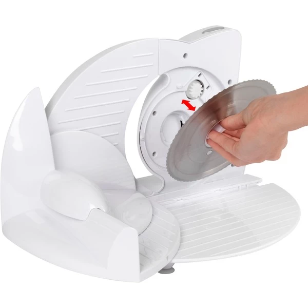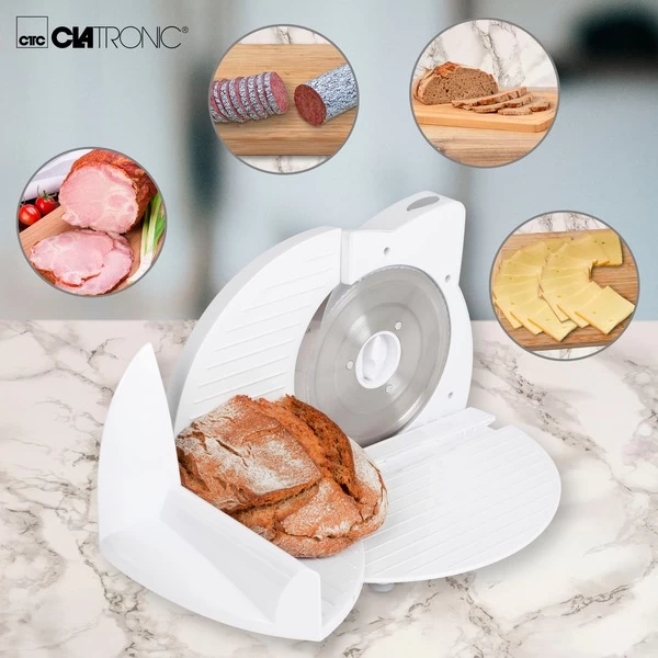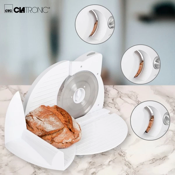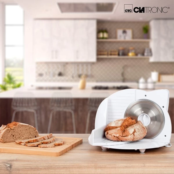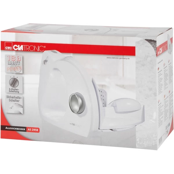 Der Clatronic Allesschneider AS 2958 schneidet durch Brot genauso problemlos wie durch Fleisch, Wurst, Brot, Gemüse oder Käse. Dank des scharfen Edelstahl-Spezialmessers schneidet die Brotmaschine auch Brotscheiben mit einer besonders starken Brotkruste ganz präzise. Die Schnittstärke kann bis zu einer maximalen Dicke von ca. 15 mm stufenlos eingestellt werden. Die Geschwindigkeit des kraftvollen 180 Watt Motors kann in drei Stufen geregelt werden. Für die Sicherheit sorgen ein 2-Finger-Einschaltsystem und der Restehalter mit Fingerschutz. Der Schlitten ist zur leichteren Reinigung abnehmbar.Art.-Nr.: 1460144