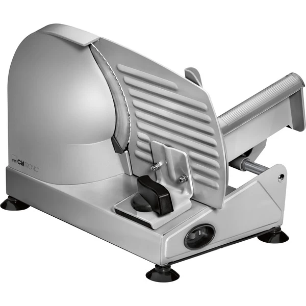 Der Metall-Allesschneider MA 3585 von Clatronic überzeugt durch die kompakte Bauweise und einer Spitzenschneidleistung von bis zu 150 Watt. Das Edelstahl-Wellenschliffmesser hat einen Durchmesser von 19cm und eignet sich ideal für Brot, Wurst oder Käse. Die Schnittstärke lässt sich dabei stufenlos von 0 bis zu 15mm einstellen. Der Allesschneider MA 3585 ist mit einem Ein- und Ausschalter, einer Metallführungsschiene und einer Anstellplatte aus Metall ausgestattet. Der Restehalter mit Fingerschutz und die Gummisaugfüße sorgen für Sicherheit beim Schneiden.Art.-Nr.: 1459862