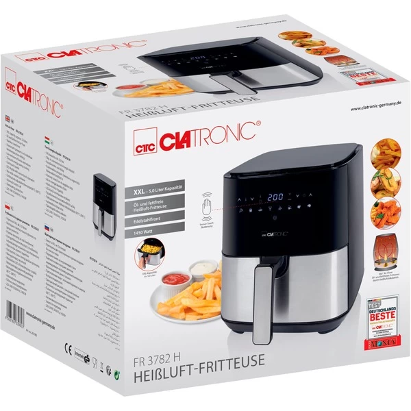 Mit der Heißluft-Fritteuse XXL FR 3782 H von Clatronic genießt man vollkommen öl- und fettfrei zubereitete Speisen wie Pommes, Chicken Nuggets oder Fisch. Dank extra großer 5 Liter Kapazität eignet sich die Heißluft-Fritteuse auch perfekt für die ganze Familie. Die Bedienung gestaltet sich dabei einfach: Auf dem beleuchtetem Sensor-Touch Display lassen sich komfortabel die Temperatur und Zeit individuell einstellen. Man kann aber auch eines der automatischen Programme auswählen. Es kann zwischen 8 Programmen gewählt werden: Pommes, Pizza, Steak, Hähnchen, Garnelen, Fisch Gemüse und Rippchen. Dank 360° Air-Flow Heißluftzirkulation wird die heiße Luft gleichmäßig überall im XXL-Garraum verteilt, sodass die Speisen gleichmäßig frittiert werden Der antihaftbeschichtete Behälter und Siebeinsatz sind zur leichten Reinigung herausnehmbar. Dank stufenlos einstellbarer Temperatur zwischen 80° – 200°C ist die Heißluft-Fritteuse individuell einstellbar. Der Cool Touch Griff bleibt immer kühl und kann somit jederzeit problemlos berührt werdenArt.-Nr.: 1900568