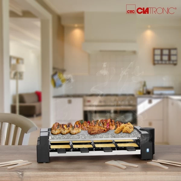 Raclette ist perfekt zum zusammensitzen und gemeinsam leckere Köstlichkeiten genießen. Ob an Weihnachten, Silvester, zum Geburtstag oder einfach so. Der RG 3678 verhilft zum gemütlichen Abend mit Familie und Freunden. Grillen und genießen, deftig oder gesund – mit dem eleganten und hochwertig verarbeiteten 2in1 Raclette-Grill von Clatronic ist das kein Problem. Das leistungsstarke Raclette besteht aus einem Naturgrillstein für gesundes und fettarmes Grillen von Gemüse und einer Wendegussplatte mit kombinierter Grillfläche zum Grillen von Fisch (glatte Oberfläche) oder Fleisch (extra tiefe Rillen für ein intensives Grillmuster). Das 180°-Drehgelenk ermöglicht eine variable Position der beiden Grillflächen. Egal ob 4 oder 8 Personen, ob langer Tisch oder runder, so findet das Raclette auf jedem Tisch seinen richtigen Platz. Zusätzlich ist das Gerät bei Benutzung für alle 8 Personen bequem erreichbar. Das RG 3678 ist dank zwei separater Ein-/Ausschalter mit Kontrollleuchte (blau beleuchtet) und der separat schaltbaren Grillflächen, auch als 4-Personen-Raclette verwendbar). Die Grillplatte und die Pfännchen sind antihaftbeschichtet. Dies ermöglicht eine leichte Reinigung nach jedem Gebrauch.Art.-Nr.: 1864166