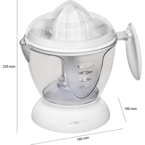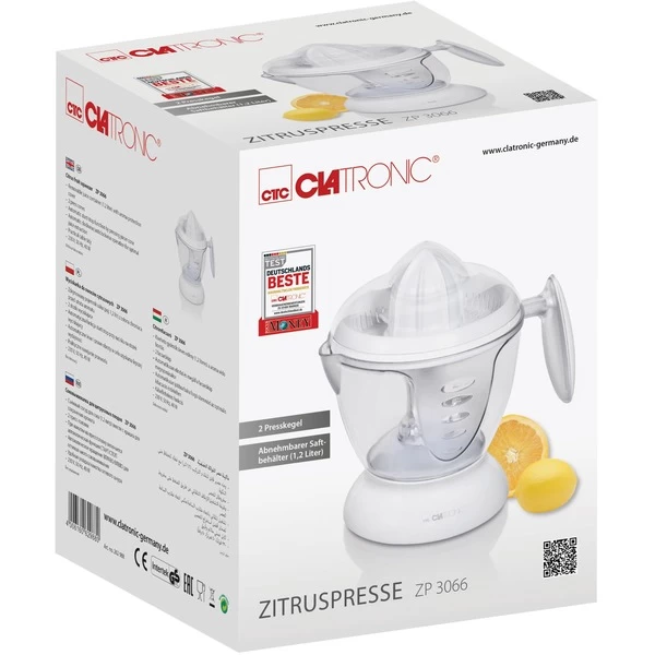 Die Zitruspresse ZP 3066 verfügt über eine Leistung von 40 Watt und automatischen Rechts-Links-Lauf für die optimale Saftausbeute. Die ZP 3066 besitzt zwei verschieden große Presskegel für alle Sorten Zitrusfrüchte und einen transparenten Aromaschutzdeckel. Die automatische Start-/Stop-Funktion bei Druck auf den Presskegel macht die Bedienung einfach und komfortabel. Der transparente und abnehmbare Saftbehälter mit Skalierung fasst bis zu 1,2 Liter. Art.-Nr.: 1654903
