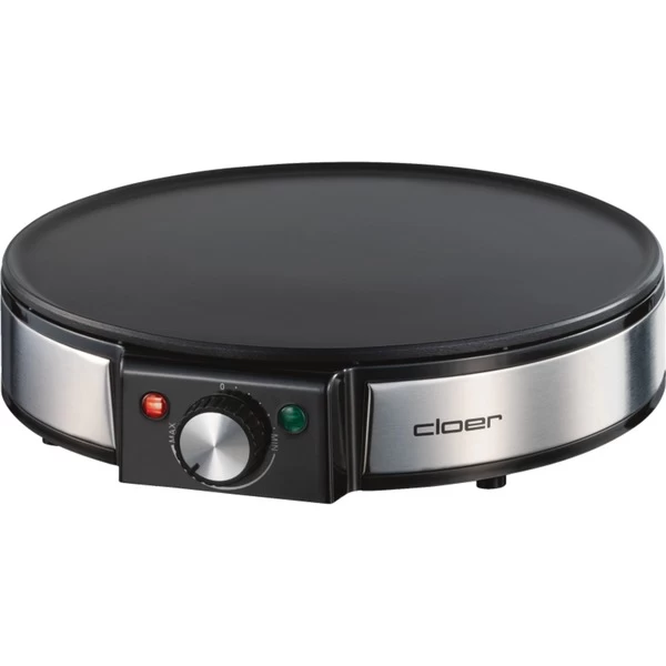 Mit dem Crêpesmaker Cloer 6630 lassen sich im Hand umdrehen süße oder herzhafte Crêpes, Galettes, Omelettes, Wraps u.v.m. ganz nach Belieben zubereiten und anschließend dekorieren. Die hochwertige Antihaftbeschichtung sorgt dafür, dass keine Teigreste auf der Platte verbleiben. Dank der variablen Temperatureinstellung per Drehregler mit roter und grüner Kontrollleuchte kann die Bräunungsstufe des 1200 Watt leistungsstarken Crêpesmaker individuell angepasst werden. Auf der 30 cm großen Backplatte wird der Teig einfach mit dem im Lieferumfang enthaltenen Teigverteiler aus Holz ausgebreitet, wobei der hochgezogene Überflussrand das Überlaufen des Teiges verhindert. Der mitgelieferte Crêpes Wender ermöglicht ein einfaches Wenden der Crêpes und schont zudem die Antihaftbeschichtung.