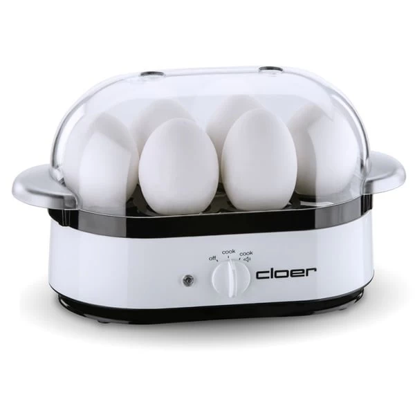 Mit dem Cloer Eierkocher 6081 kocht man maximal sechs Eier auf einmal. Mit dem beiliegenden Meßbecher kaltes Wasser abmessen, Eier in den Einsatz stellen und abdecken. Wenn die Eier fertig sind ertönt ein akustisches Signal. Der praktische Ei-Halter lässt sich zum Abschrecken herausnehmen. Durch das Perforieren der Eierschale mit dem integrierten Ei-Pick an der Unterseite des Messbechers vermeidet man geplatzte Eier.Art.-Nr.: 1675947