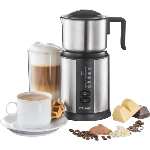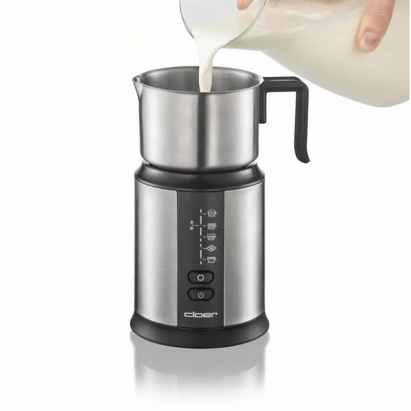 Der Milchaufschäumer 7789 von Cloer überzeugt mit 500 Watt Leistung. In dem abnehmbaren Metallbehälter mit Deckel lassen sich bis zu 250 ml Milch aufschäumen. Die Bedienung ist dank des Ein-/Ausschalters und der 5 unterschiedlichen Modi sehr einfach. Das Aufschäumen der Milch erfolgt mit einer magnetischen Spule und das ganz ohne Führungsstab oder Führungsachse in dem Edelstahlkännchen. Die Spule wird wie von unsichtbarer Hand zentriert und angetrieben. Wird der fertige Milchschaum ausgegossen, fällt die Spule nicht in die Tasse, sondern haftet seitlich an dem Kännchen. Die Reinigung ist aufgrund nicht notwendiger Führungselemente sehr leicht. Milchkännchen, Spule und falls notwendig der Deckel können unter fließendem Wasser oder in der Spülmaschine gereinigt werden.
