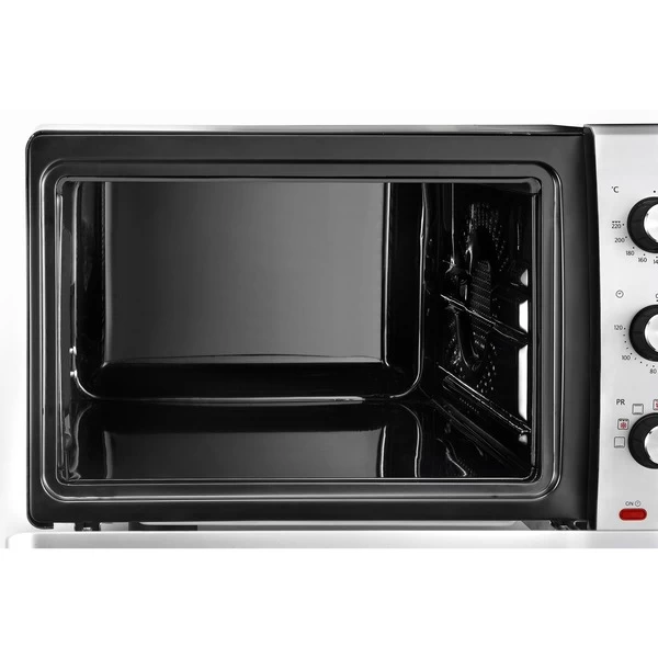 Grill, Auftauen, Warmhalten (60°C), Schongaren, kommen noch zwei neue hinzu: Konvektor und Gratinieren (Umluft mit Grill). Bei der Konvektor-Funktion wird durch die Kombination aus Ventilation und einem speziellen Heizelement die Wärme im Ofen gleichmäßig verteilt, wodurch das Garen auf zwei Ebenen möglich ist. Die Bedienung erfolgt über drei Drehregler. Mit den multifunktionalen Knöpfen lässt sich die Temperatur von 80°C bis zu 220°C sowie die gewünschte Funktion leicht einstellen. Ein 120 Minuten Timer sowie eine Abschaltautomatik mit Tonsignal bei Backzeitende runden die Ausstattung ab. Die Warmhaltefunktion hält Lebensmittel nach dem Garen warm ohne sie auszutrocknen. Durch ein spezielles Dämmsystem