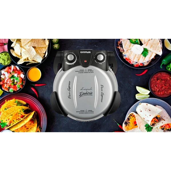 Mit dem elektrischen Pizzamaker Delizia von G3 Ferrari gelingen Pizzen zu Hause so einzigartig und knusprig wie aus dem Steinbackofen beim Italiener. Der G3 Ferrari Pizzaofen erreicht Temperaturen von bis zu 400 Grad, für perfekte Backergebnisse. Er eignet sich auch zum schnellen Aufwärmen und Aufbacken von frisch duftendem Brot, Croissants und Baguette. Blitzschnell in nur ca. 5 Minuten ist selbstgemachte Pizza servierbereit, Tiefkühlpizza in ca. 3 Minuten. Durch das Backen mit dem feuerfesten, lebensmittelechten Naturstein wird die Feuchtigkeit des Teiges absorbiert und die Hitze im Stein gespeichert und gleichmäßig an den Teig abgegeben. Das Ergebnis ist ein besonders gleichmäßig knuspriger Boden, lecker und kross. Der Pizzaofen Delizia bietet vielfältige Möglichkeiten, morgens, mittags und abends: Leckere warme Brötchen oder Toast am Morgen, frische Burritos oder Wraps zu Mittag, krosse neapolitanische Pizza, Fladen, Lahmacun oder Flammkuchen zum Feierabend. Dabei ist der Pizzaofen praktisch, einfach in der Bedienung und so kompakt, dass er einfach mitgenommen werden kann, zum Geburtstag, Filmevent, Fußballspiel, Mädelsabend, Camping, nettes Zusammensein oder als Geschenkidee. Durch das ansprechende Design und die vielen erhältlichen Farben ist der Pizzaofen ein Blickfang für jede Küche.Art.-Nr.: 1720159