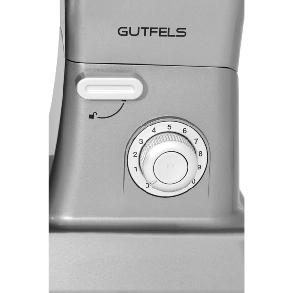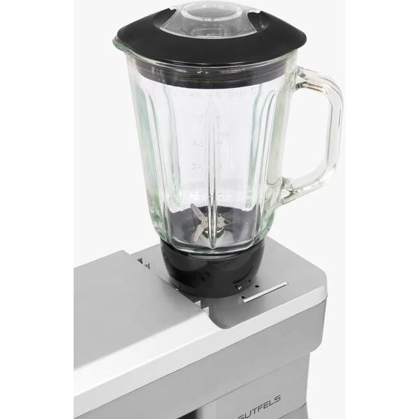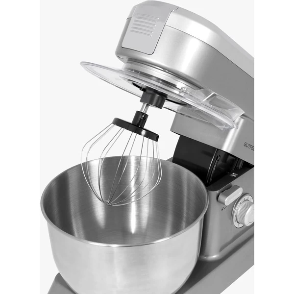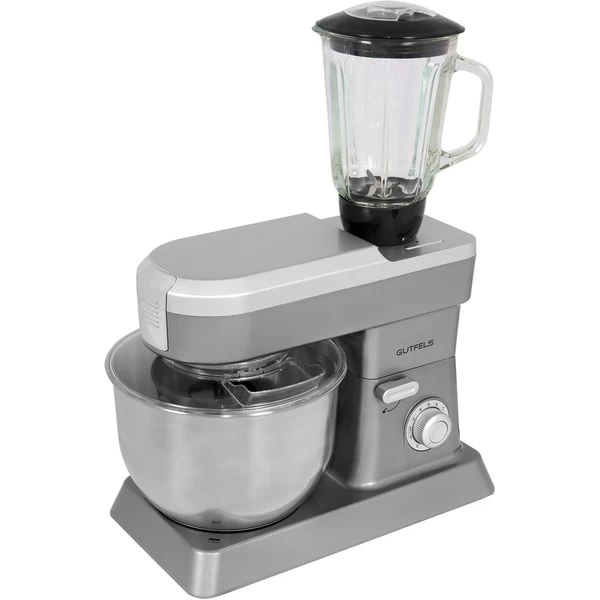 Mit der silbernen Küchenmaschine KM 8101 SI von Gutfels können die verschiedensten Lebensmittel zubereitet werden. Zur Ausstattung gehören ein Fleischwolf, ein Mixbehälter aus Glas, Schneebesen und Rührhaken. Mit dem 1.200 Watt Motor, den 10 Geschwindigkeiten mit Turbofunktion und der Plusfunktion wird zerkleinert, gerührt und gemixt. Während des Betriebes ist dank des transparenten Deckels für Spritzschutz gesorgt und man hat die Lebensmittel gut im Blick. Die Edelstahl-Rührschüssel hat ein Fassungsvermögen von 6,2 Liter, der beiliegende Mixbehälter ein Fassungsvermögen von 1,5 Liter. Die rutschfesten Standfüße sorgen auch bei hohen Geschwindigkeiten für einen sicheren Stand.Art.-Nr.: 1796420