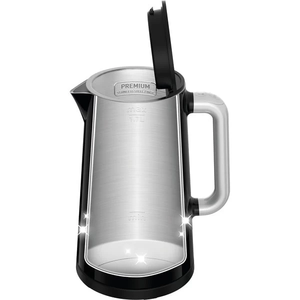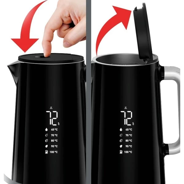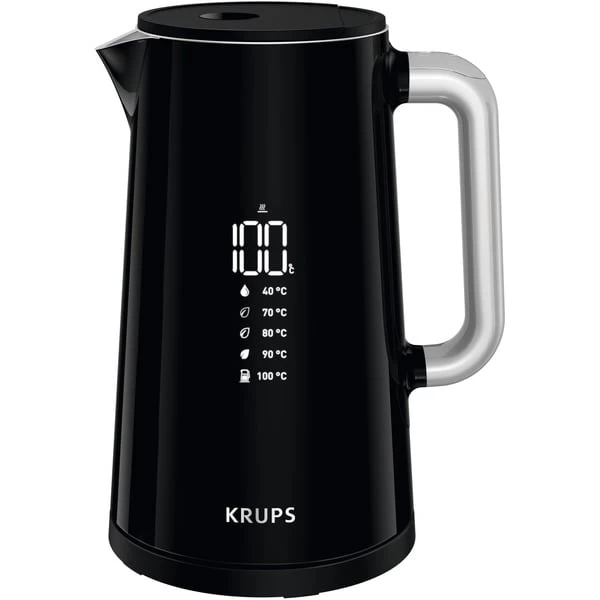 Mit dem modernen Smart’n Light BW 8018 Wasserkocher von Krups, der ebenso raffiniert wie fortschrittlich ist, genießt man Heißgetränke genau in der richtigen Temperatur, perfekt für jeden Geschmack. Mit einer integrierten Digitalanzeige im Gehäuse, auf der die Wassertemperatur in Echtzeit abzulesen ist, bietet der Wasserkocher fünf verschiedene Temperatureinstellungen von 40 °C bis 100 °C – perfekt zum Wasserkochen auf einfache Berührung. Die doppelwandige Konstruktion hält innen die Wärme, während die Außenseite für optimale Sicherheit kühl bleibt. Weitere praktische Funktionen sind die 30-Minuten-Warmhaltefunktion, damit die Getränke stets zur richtigen Zeit fertig sind, ein automatischer Deckelöffner für eine einfache Befüllung sowie ein 360°-Sockel. Dank des großen Fassungsvermögens von 1,7 l (bis zu 7 Tassen), ideal für alle Heißgetränke. Krups bietet mit dem Smart’n Light BW 8018 eine moderne, schlanke Ausführung des elektrischen Wasserkochers.