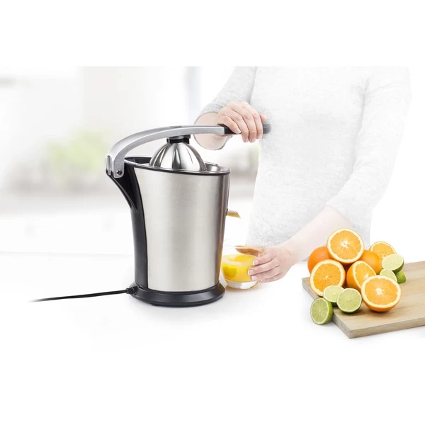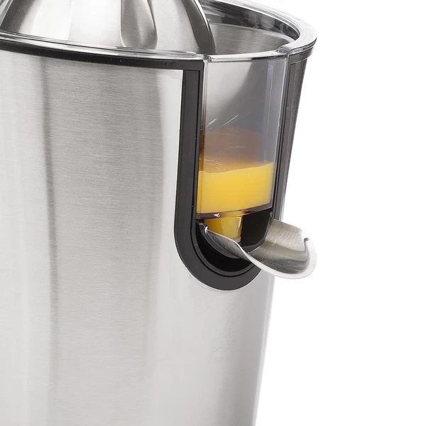 Das Pressen von Zitrusfrüchten wie Orangen ist mit dem Princess Master Juicer Pro ein Kinderspiel. Diese leistungsstarke Zitruspresse hat einen Griff und einen Edelstahlkonus sowie ein Fruchtfleischfilter. Sie verfügt über 300 Watt Leistung, sodass man große und kleine Zitrusfrüchte pressen kann – sogar Granatäpfel. Das gesamte Gehäuse ist aus Edelstahl gefertigt. Das gilt auch für den Konus und den regulierbaren Fruchtfleischfilter. Der Entsafter verfügt über einen Hebel, mit dem sich die Zitrusfrüchte einfach und schnell auspressen lassen. Perfekt, um viele Gläser Orangensaft in kürzester Zeit zuzubereiten. Somit eignet sich diese professionelle Orangenpresse ideal für das Gaststättengewerbe oder bei Anlässen, für die viele Früchte gepresst werden müssen. Die Presse ist mit rutschhemmenden Füßen ausgestattet, sodass sie immer fest auf der Arbeitsplatte steht, auch während des Auspressens. Darüber hinaus hat die Zitruspresse Princess Juicer Pro ein schickes Design, bei dem Edelstahl mit schwarzen Elementen kombiniert wurde – eine wahre Schönheit für die Küche. Nach der Verwendung lässt sie sich einfach zerlegen und dank des robusten Edelstahlmaterials können sämtliche Teile des Master Juicer Pro in dem Geschirrspüler gereinigt werden.