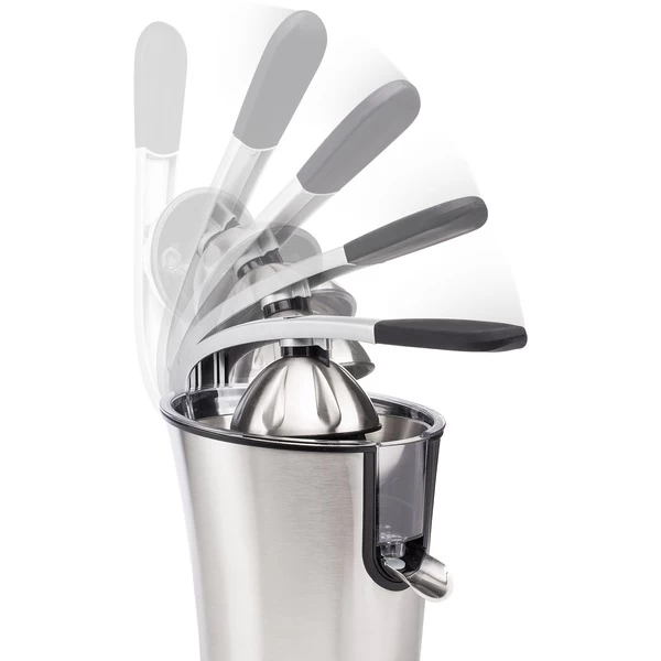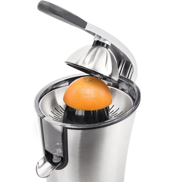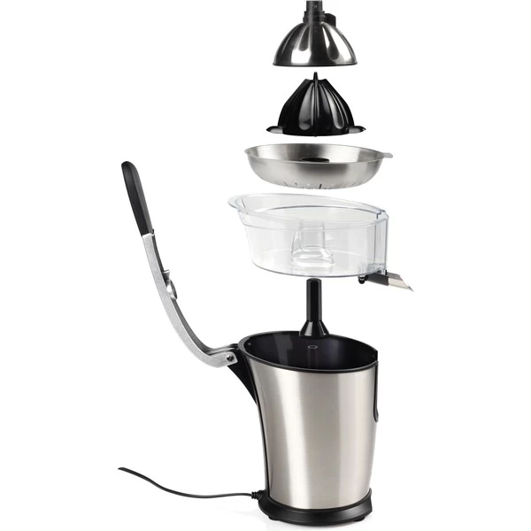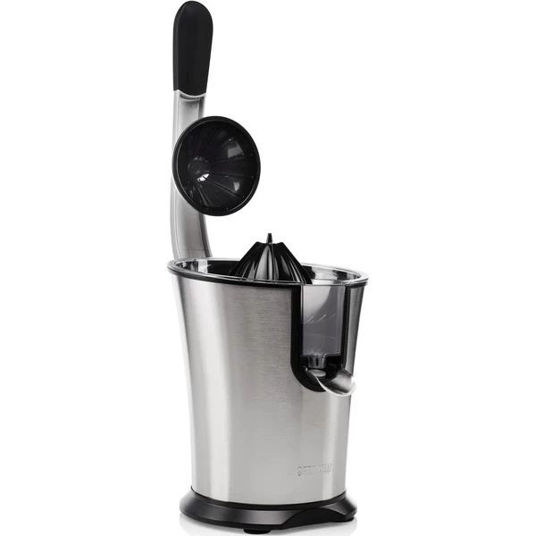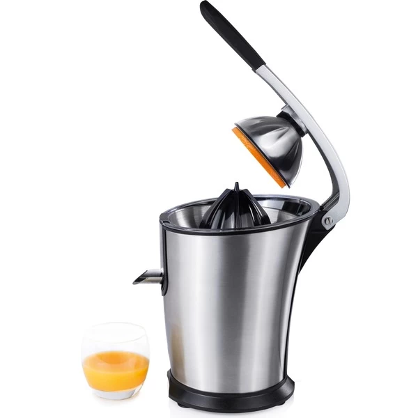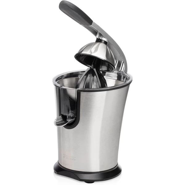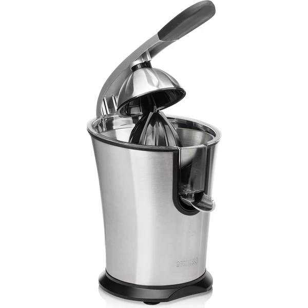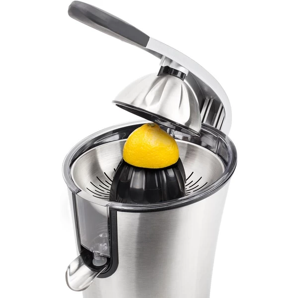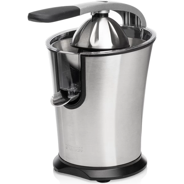 Mit der Zitruspresse Master kann man Zuhause wie die Profis entsaften. Die halbprofessionelle Zitruspresse verfügt über einen Hebelarm aus Aluminiumguss, mit dem ohne viel Kraftaufwand selbst das letzte Safttröpfchen mühelos ausgepresst werden kann. Die innovative Kegelform eignet sich für alle Zitrusfrüchte, von Grapefruit bis Limone. Durch die hochgezogenen Kanten des speziellen Kegelgehäuses eignet sich der Princess Master Juicer zum Entsaften großer und kleiner Zitrusfrüchte in sehr kurzer Zeit. Durch die Kanten bleibt die Zitrusfrucht fest im Gerät kann beim Auspressen nicht verrutschen. Über das Fruchtfleischsieb fließt der Saft direkt ins Glas. So erhält man köstlichen, frischen und vitaminhaltigen Saft im Handumdrehen für die gesamte Familie. Der leistungsstarke 160 Watt Motor sorgt dafür, dass der gesamte Saft aus den Zitrusfrüchten gepresst wird, dabei ist er aber sehr leise. Alle abnehmbaren Teile der Princess Master Zitruspresse sind spülmaschinenfest. Die Saftpresse ist außerdem mit einem Tropfschutz ausgestattet.Art.-Nr.: 1466862