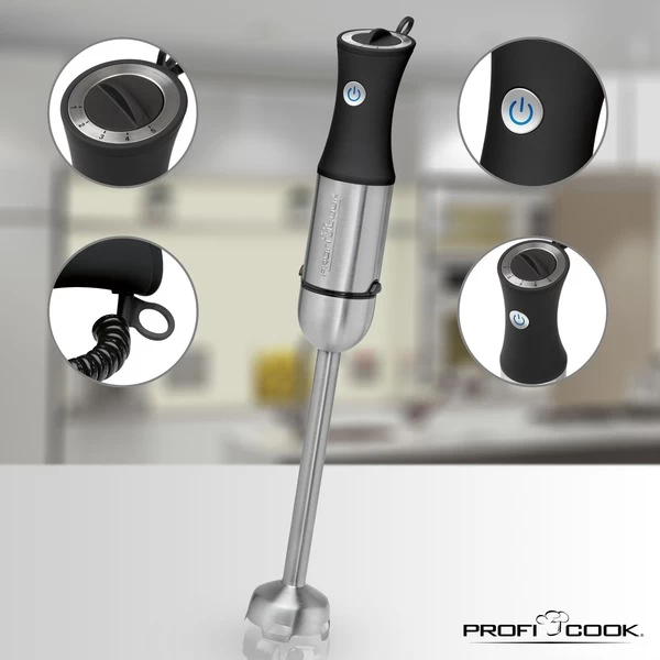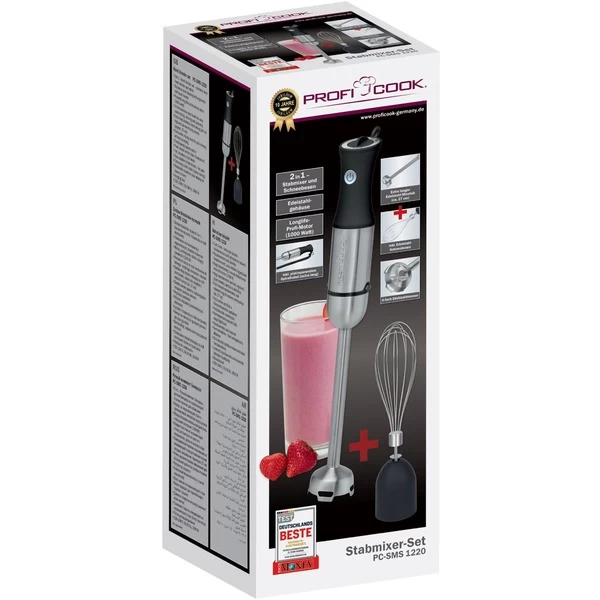 Das 2in1 Stabmixer-Set PC-SMS 1220 mit Schneebesen von ProfiCook ist, dank 1000 Watt Longlife-Profi-Motor, perfekt geeignet zum schnellen Mixen und Pürieren von Suppen, Saucen, leichten Teigen, Babynahrung, Milchshakes usw. Durch den extra langen Stab ist er auch für hohe und schmale Mixgefäße (ca. 27 cm) geeignet. Der breite Mixkopf sorgt für sicheres, spritzgeschütztes Zerkleinern und kann auch im heißen Topf zum Einsatz kommen. Ausgestattet ist der PC-SMS 1220 mit einem 4-fach Edelstahlmesser, einer stufenlosen Geschwindigkeitsregulierung, einem blau beleuchteten Tastschalter sowie einem ergonomischen Soft Touch-Griff.