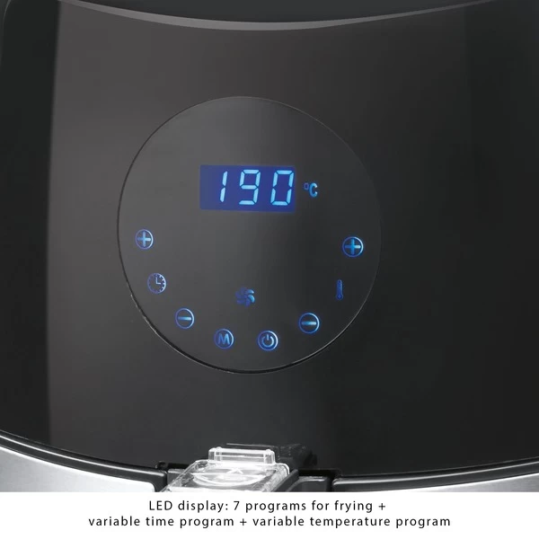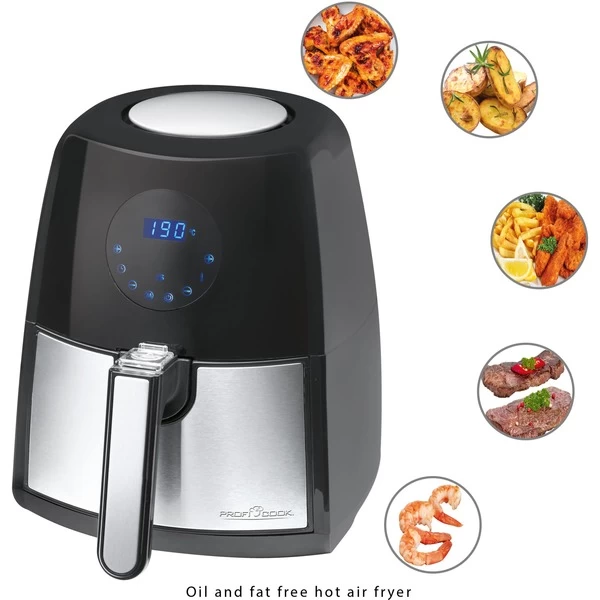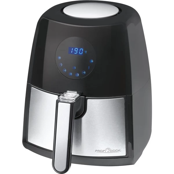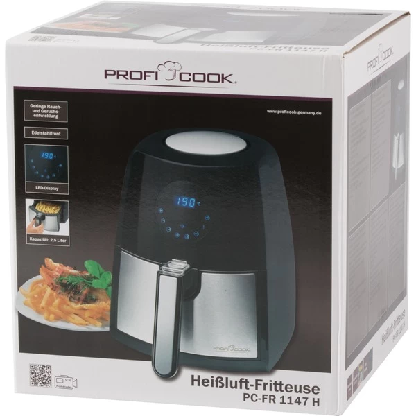 Mit der Heißluftfritteuse PC-FR 1147 H von ProfiCook kann man nahezu öl- und fettfrei frittieren. Besonders komfortabel ist die Bedienung über das digitale Bedienfeld mit LED-Display. Es gibt sieben Frittierprogramme sowie ein variables Zeit- und Temperaturprogramm. Mit dem großen Volumen von 2,5 L können leckere Gerichte zubereitet werden. Die innovative Luftzirkulation ermöglicht es die Speisen zu frittieren, grillen, rösten und backen und das mit geringer Rauch- und Geruchsentwicklung. Der herausnehmbare Behälter ist zur einfachen Reinigung antihaftbeschichtet.Art.-Nr.: 1459566