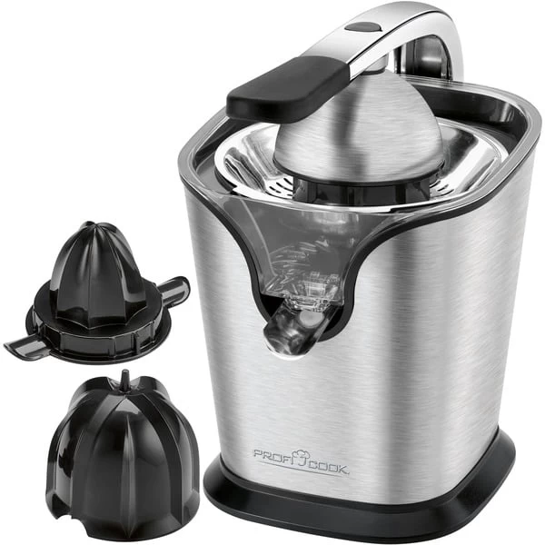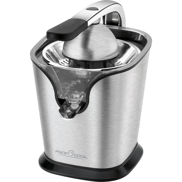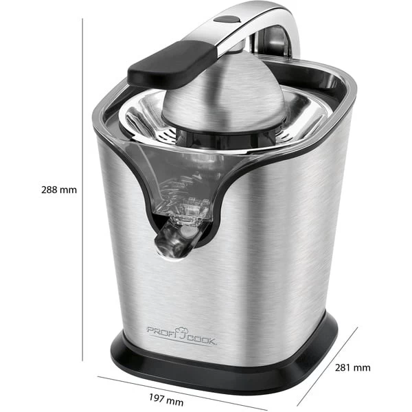 Die Zitruspresse PC-ZP 1154 im hochwertigen Edelstahlgehäuse von ProfiCook überzeugt durch hohe Saftausbeute und leichte Reinigung. Der leistungsstarke Longlife-Profi-Motor entsaftet Zitrusfrüchte bis zum letzten Tropfen und nach kurzer Zeit kann man seine Lieblingssäfte genießen. Der Hebel-/Pressarm aus hochwertigem Aluminium, mit Soft-Touch-Griff sorgt für eine bequeme Handhabung und maximale Saftausbeute. Mit etwas Druck auf den Hebel startet das Gerät den Motor selbstständig. Mit den zwei Presskegeln in unterschiedlichen Größen, lassen sich Grapefruits, Zitronen, Limetten oder Orangen entsaften. Die PC-ZP 1154 verfügt zudem über einen Edelstahl-Saftausguss mit Tropfstopp-Funktion. Bevor man das Gefäß mit dem frisch gepressten Saft entfernt, kann der Ausguss nach oben gedrückt werden, um die Auslassöffnung des Saftbehälters zu verschließen und ein Nachtropfen zu vermeiden. Bei der Verarbeitung sorgen rutschfeste Saugfüße für einen sicheren Stand des Gerätes. Für eine schnelle und problemlose Reinigung lässt sich die Zitruspresse komplett zerlegen. Und wenn die Zeit mal fehlt – die Teile sind auch für die Spülmaschine geeignet. Mit der PC-ZP 1154 von ProfiCook genießt man frisch gepresste und gesunde Getränke.