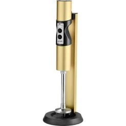 Der Stabmixer stilo7 in gold verfügt über eine hohe Materialqualität und besteht zum größten Teil aus stabilem Metall, während der Griff zugunsten angenehmer Ergonomie aus hochwertigem Kunststoff ist. Aufgrund des Akkubetriebs sorgt der kabellose Stabmixer für absolute Freiheit beim Kochen. Über eine LED-Anzeige kann der Ladestand des Akkus einfach abgelesen werden. Der Lithium-Ionen-Akku wird dank intelligenter Ladetechnik schonend und langsam aufgeladen ohne zu überladen. Der Ladevorgang endet automatisch, sobald der Akku voll ist. Diese Ladetechnik sorgt für eine lange Lebensdauer des Akkus. Auch das Thema Sicherheit kommt beim Stabmixer stilo7 nicht zu kurz: Er verfügt über ein Sicherheits-2-Finger-Einschaltsystem. Damit ein versehentliches Anschalten verhindert wird, müssen Entsperr- und Einschalttaste gleichzeitig betätigt werden. Der Stabmixer läuft mit maximaler Drehzahl von ca. 12.000 Umdrehungen pro Minute an. Mithilfe des Durchschaltsystems können dann zwei weitere niedrigere Drehzahlstufen ausgewählt werden. Als Schutz vor Überlastung schaltet das Gerät beispielsweise bei Blockade des Messers oder Überhitzung automatisch ab. Mit dem Universalmesser lassen sich die meisten Lebensmittel Pürieren. Der Kunststoff-Mixbecher ist durch seine schmale, hohe Form optimal für die Verarbeitung geeignet.Art.-Nr.: 1834776