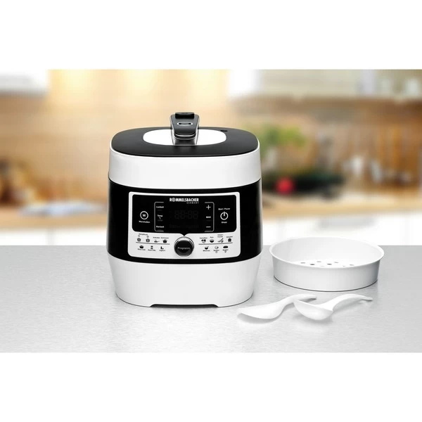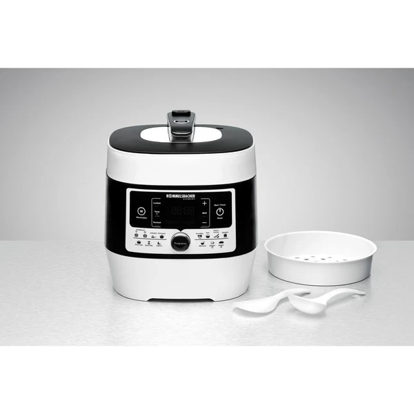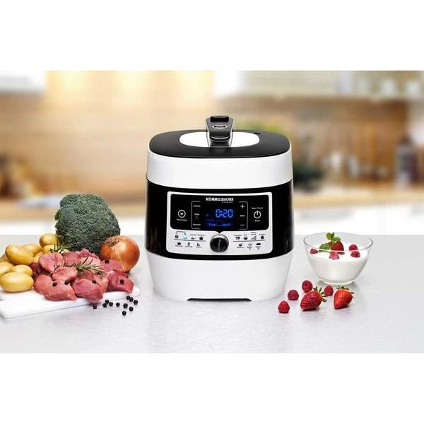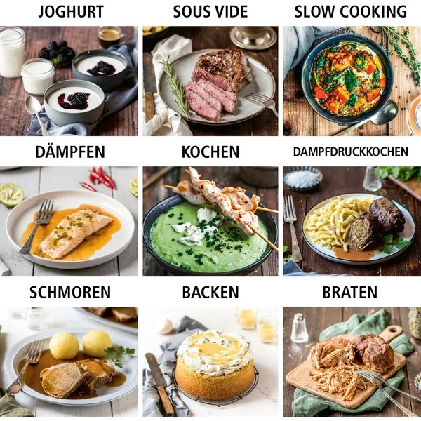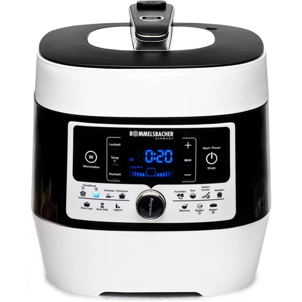 Kochen unter Dampfdruck ist aus der traditionellen Küche nicht wegzudenken. Der digitale Dampfdruck- & Multikocher MD 1000 macht diese Zubereitungsart fit für das neue Jahrtausend. Zeit, Energie und Platz sparen: bis zu 9 Küchengeräte kann dieses Multitalent ersetzen. Mit ihm lässt sich hervorragend Kochen, Dämpfen, Braten, Schmoren, cremiger Milchreis und Joghurt zubereiten und sogar Brot backen. Auch für moderne Garmethoden wie ‚Sous Vide‘ und ‚Slow Cooking‘ ist er schnell einsatzbereit. Insgesamt stehen 14 Kochprogramme, mit und ohne Dampfdruck, zur Verfügung. Ob ohne, mit Normal- oder Soft-Dampfdruck – die Elektronik steuert den Kochvorgang vollautomatisch und sicher. Alle Programme können individuell angepasst werden auch manuelle Einstellungen sind möglich. Dieser ‘Hans Dampf‘ überzeugt in allen Bereichen durch nährstoffschonende Ergebnisse. Die Zubereitung spart bis zu 70 % an Zeit und 50 % an Energie gegenüber herkömmlichen Kochverfahren. Die Abschaltung erfolgt automatisch, der anschließende Warmhaltemodus hält das Gericht bis zu eine Stunde lang auf Temperatur. Hochwertige Materialien und eine durchdachte Konstruktion sorgen für hohe Bedienfreundlichkeit. Der herausnehmbare Kochtopf ist antihaftbeschichtet und leicht zu reinigen. Dank der kompakten Bauweise kann das Gerät nach der Nutzung sehr platzsparend aufbewahrt werden. Ein universelles Küchengerät, das man bald nicht mehr missen möchte.Art.-Nr.: 1519325