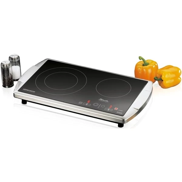 Die Zukunft hat begonnen: Nun gibt es von Rommelsbacher auch die Doppelkochplatte CT 3403/TC mit Glaskeramik Kochfeld in einem eleganten Edelstahl Gehäuse mit Softline Design. Die freistehende Kochplatte ist das Schmuckstück jeder Küche. Ideal als Zusatzgerät zum normalen Herd, perfekt für kleine Küchen, Büros und Appartements und äußerst beliebt im Catering Bereich für Buffets und Kochvorführungen. Die Ausstattung erfüllt alle Ansprüche: die HiLight® Heizzonen werden stromsparend über Touch Control in jeweils 9 Stufen geregelt. Die Zweikreis Lösung erlaubt die Zuschaltung einer extra großen Zone mit 210 mm Ø, perfekt für große Kochgefäße. Zwei Kontrolllampen und zwei Restwärmeanzeigen sind selbstverständlich. Überhitzungsschutz und Ankochautomatik sorgen für Sicherheit und besten Komfort.Art.-Nr.: 1518837
