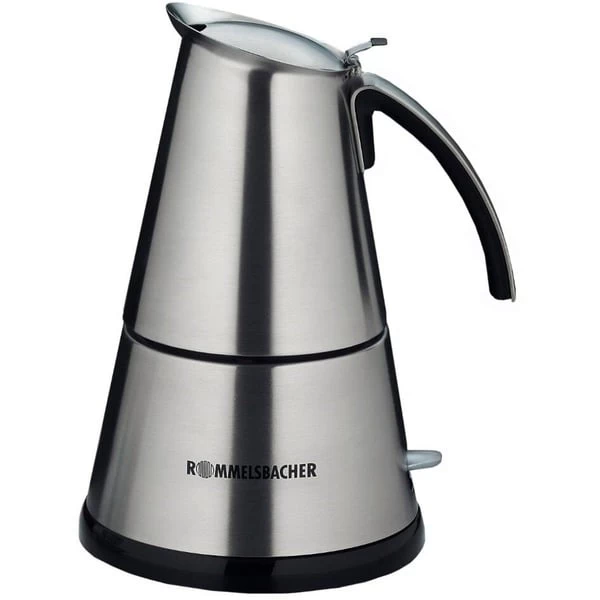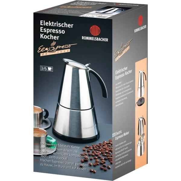 Der Espresso-Kocher Rommelsbacher EKO 364/E Elpresso mini ist die beste Voraussetzung für original italienischen Espresso. Geformt aus hochwertigem Edelstahl ist sein Design bereits ein Blickfang, während der ergonomisch geschwungene Edelstahl-Griff mit wärmeisolierendem Kunststoff auf der Innenseite Verbrennungen vermeidet. Ob nun zwei oder vier Tassen Espresso: die Bedienung des EKO 364/E Elpresso mini ist einfach und bequem. Wasser und Espressopulver einfüllen, die Kanne auf den Zentralsockel aufsetzen, einschalten und los geht’s. Sobald der Espresso fertig ist, schaltet sich der EKO 364/E Elpresso mini deLuxe automatisch ab.Art.-Nr.: 954400
