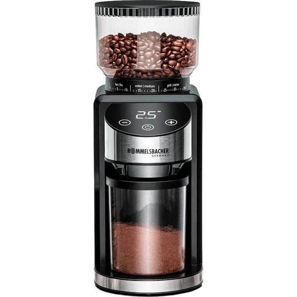 Die Rommelsbacher Kaffeemühle EKM 400 eignet sich für höchste Ansprüche und überzeugt durch konstant perfekte Mahlergebnisse. Das hochwertige Kegelmahlwerk aus Edelstahl bietet die aromaschonendste Art, um Kaffee- und Espressobohnen ganz nach Bedarf zu mahlen. Der Mahlgrad kann ganz nach Bedarf in 35 Stufen von extra fein für Espresso, mittelfein für Kaffeepulver bis hin zu grobem Pulver für French Press vorgewählt werden. Bei der Dosierung sind bis zu 12 Portionen in einem Durchgang möglich. Dabei ist die Portionsgröße in 10 Stufen exakt nach persönlichem Geschmack einstellbar. Bohnenbehälter und Auffangbehälter bieten guten Einblick und Aromaschutz. Das Gerät überzeugt darüber hinaus durch die integrierte Antistatik-Funktion, welche die statische Aufladung des gemahlenen Pulvers vollkommen neutralisiert. Zusätzlich gibt es die Option, das Kaffeepulver direkt in einen Siebträger zu mahlen. Durch den abnehmbaren Siebträgerhalter wird diese Kaffeemühle zur perfekten Ergänzung für Siebträgermaschinen. Die EKM 400 ist eine Kaffeemühle, die viel Professionalität für anspruchsvolle Kaffee- und Espresso-Liebhaber bietet.Art.-Nr.: 1902650
