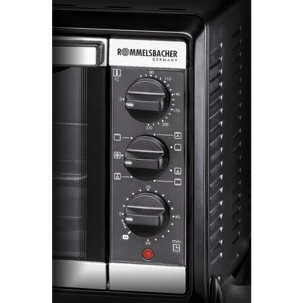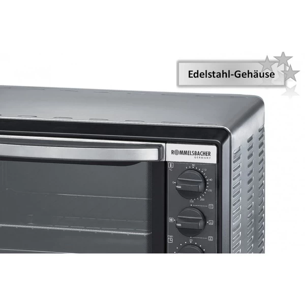 Der Rommelsbacher Kleinbackofen mit Umluft BG 1055/E sollte in keinem Haushalt fehlen. Energiesparend und schnell dank optimaler Garraumgröße, 2-facher Türverglasung, Backraumdichtung und Edelstahl Heizelementen. Durch die getrennt regelbare Ober- und Unterhitze gelingen Braten und Aufläufe perfekt. Die Umluftfunktion sorgt für gleichmäßige Backergebnisse bei Kuchen und Pizzen und eine zusätzliche Auftaufunktion macht die Vielseitigkeit dieses Kleinbackofens vollkommen. Was auch immer man zubereiten will mit dem Kleinbackofen mit Umluft BG 1055/E es gelingt mühelos. Angenehmen Bedienkomfort bieten die 60 Minuten Zeitschaltuhr mit Dauerstellung, die stufenlose Temperaturregelung von 80°C bis 230°C sowie die praktische Innenbeleuchtung des Backraums. Und dank der Antihaftbeschichtung ist der Kleinbackofen mit Umluft BG 1055/E auch sehr einfach zu reinigen.Art.-Nr.: 943766