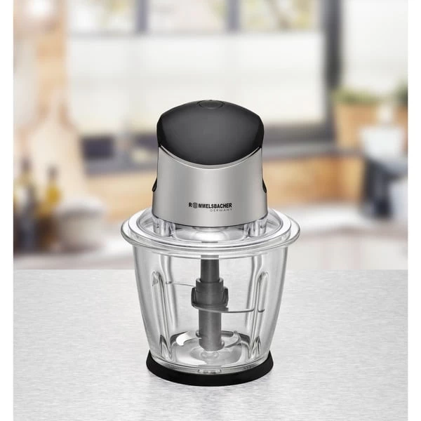 Mit dem hochwertigen Multi Zerkleinerer MZ 500 von Rommelsbacher macht Küchenarbeit Spaß. Hacken, Schneiden, Pürieren – mit einem leichten Druck auf die Einschalttaste verarbeitet das Gerät Kräuter, Zwiebeln, Käse, Fleisch, Obst, Beeren, Nüsse (ohne Schale), Kartoffeln, Gemüse, Rohkost & mehr. Im Handumdrehen entstehen gesunde, vitaminreiche Rohkostsalate, cremige Brotaufstriche, fantasievolle Dips und Pesto. Auch Gewürzmischungen und Gewürzsalze lassen sich hervorragend darin herstellen. Das 4-flügelige Messer aus rostfreiem Edelstahl arbeitet sehr effizient und überzeugt durch perfekte Ergebnisse. Der klare Glasbehälter ist äußerst robust, lebensmittelneutral, hygienisch und sehr leicht zu reinigen. Er hat ein Fassungsvermögen von 1,5 Litern. Ein kraftvoller Motor meistert alle Anforderungen leise und vibrationsarm und das integrierte Sicherheitssystem schützt vor unabsichtlicher Aktivierung. Zur leichten Reinigung können alle abnehmbaren Teile in die Spülmaschine. Art.-Nr.: 1519347