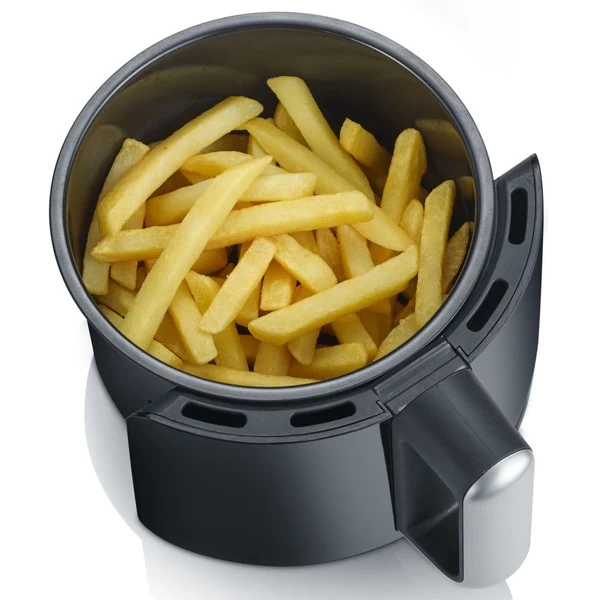 Mit der FR 2455 Kompakt-Heißluftfritteuse von Severin lassen sich vielseitige und gesunde Gerichte ohne die Zugabe von Öl oder Fett schnell und energiesparend dank innovativer Heißluft-Technologie zubereiten. Die Kompakt-Heißluftfritteuse ist in einem platzsparenden Design gehalten und benötigt auf der Arbeitsfläche weniger Platz als ein DIN A4 Blatt und eigent sich perfekt für kleine Haushalte. In dem Frittierkorb mit einer Kapazität von 1,8 Litern lassen sich bis 2-3 Portionen Pommes-Frittes (ca. 500 – 600 g) zubereiten. Die Bedienung erfolgt über ein intuitives LED Display mit Touch-Bedienung und einstellbarer Temperatur und Garzeit. Der Frittierkorb ist mit einer keramischen Beschichtung ausgestattet, so wird die Kratzfestigkeit erhöht und es haftet nichts an. Art.-Nr.: 1740297