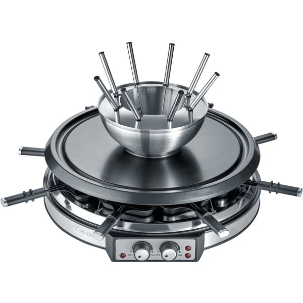 Das RG 2348 ist eine praktische 2-in-1-Kombination aus Raclette und Fondue in hochwertigem Edelstahl-Design für vielfältiges Grillvernügen für 8 Personen mit nur einem Gerät. Das RG 2348 ist mit zwei separat regelbaren Heizelementen für Raclette und die Fondue-Funktion ausgestattet. Entscheidet man sich für Raclette, ist im Lieferumfang ein Grillstein (ø ca. 13 cm) zum Warmhalten von Speisen und zur schonenden Zubereitung von Fisch und Gemüse enthalten. Acht antihaftbeschichtete Raclette-Pfännchen erleichtern die Entnahme der gratinierten Zutaten und sorgen für eine leichte Reinigung. Für Fondue ist ein hochwertiger Topf aus Edelstahl und acht Fonduegabel enthalten. für eine kinderleichte und unkomplizierte Reinigung. Durch die regelbare Temperatur eigent sich das RG 2348 perfekt auch für Schokoladen-Fondue und Käse-Fondue. Die XXL-Komfortzuleitung mit ca. 200 cm Länge sorgt für Flexibiltät.Art.-Nr.: 1740249