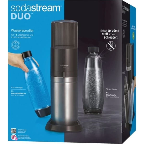 | Hinweis | Der Duo Titan 1+1 von SodaStream ist NUR für die Verwendung mit Duo Glas- und Kunststoffflaschen geeignet. Soda-Club oder SodaStream Crystal und SodaStream Easy Flaschen sind nicht kompatibel. Das Füllvolumen der Glaskaraffe beträgt bis zur Fülllinie 0,84 ml. Der SodaStream-Zylinder ist nur zur Verwendung in geeigneten Trinkwassersprudlern gedacht. | ||