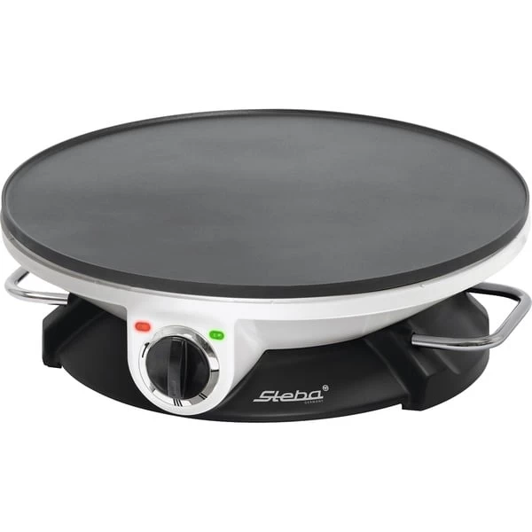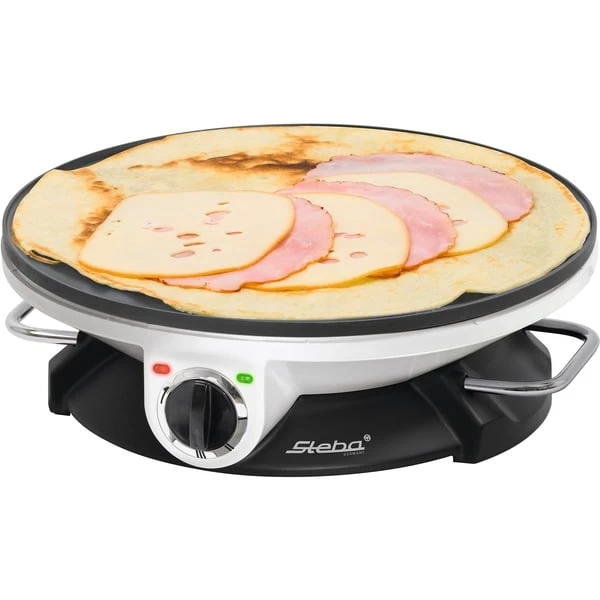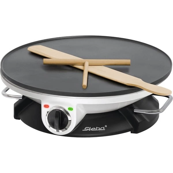 Mit dem Steba Crêpesmaker CR 32 lassen sich schnell und einfach leckere Crêpes zubereiten. Dank der beiligenden Schöpfkelle lässt sich immer die richtige Menge Teig dosieren. Der CR 32 hat eine stufenlose Temperaturregelung, so dass die gewünschte Bräunung leicht zu erzielen ist. Um die antihaftbeschichtete Oberfläche zu schonen ist neben einem Teigrechen auch ein Crêpeswender aus Holz im Lieferumfang enthalten. Art.-Nr.: 1395383