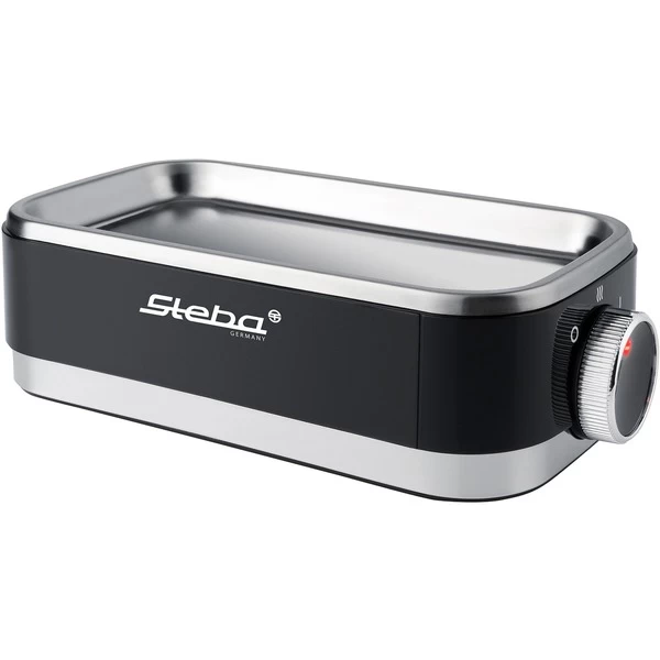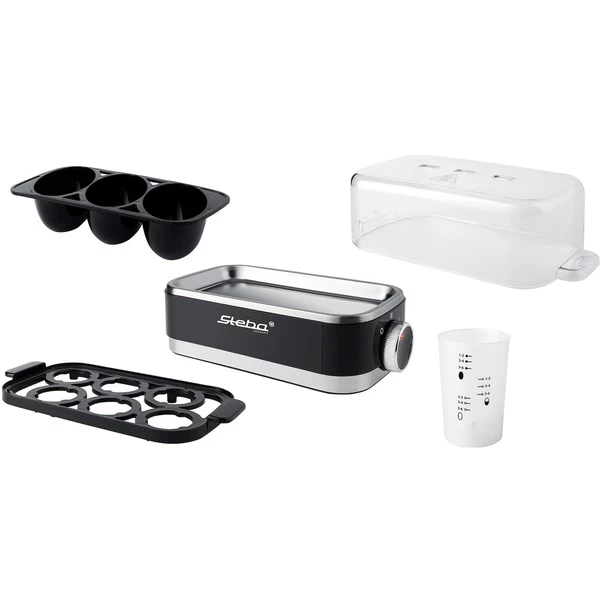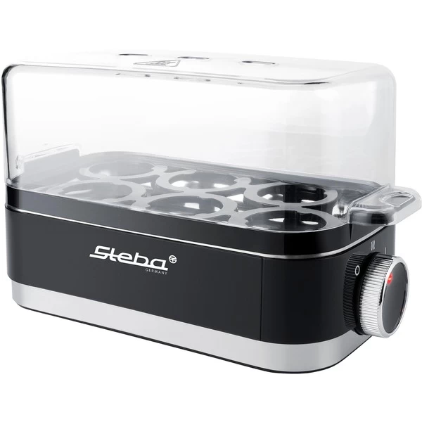 Der elegante Eierkocher EK 7 von Steba kocht bis zu sechs Eier. Mit dem zugehörigen Meßbecher sowie dem Eierstecher gelingen die Eier nach Wunsch, auch pochierte Eier sind mit dem enthaltenen Einsatz möglich. Die Bedienung erfolgt ganz einfach über einen Drehschalter. Dann füllt man kaltes Wasser in die Edelstahlkochschale und deckt die Eier mit einer Klarsichthaube ab. Wenn die Eier fertig sind ertönt ein akustisches Signal. Der praktische Eiertray mit Tragegriff lässt sich zum Abschrecken herausnehmen. Für weiteren Bedienkomfort sorgen die Warmhaltefunktion und eine Kontrolleuchte. Art.-Nr.: 1594521