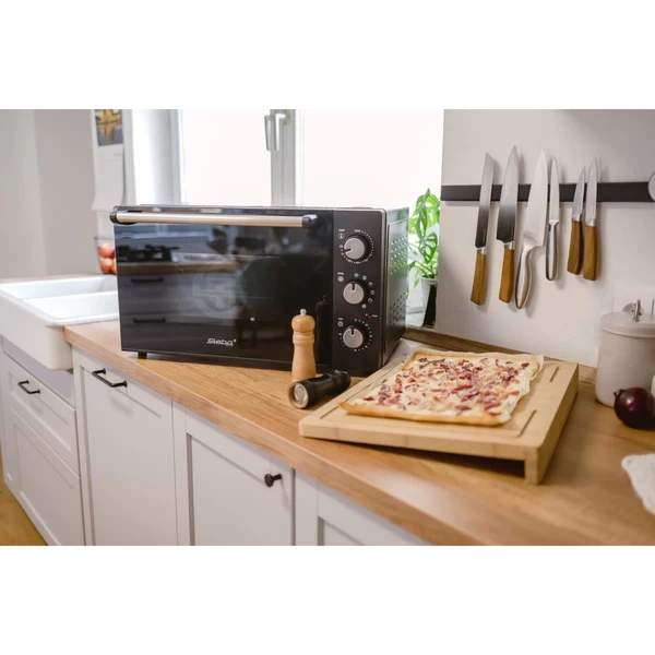 Der Steba Grillbackofen KB M42 mit Ober-/Unterhitze und zuschaltbarer Umluft eignet sich hervorragend zum Backen von Pizza. Dank des 42 l Innenraums und des großen Drehspießes, der Platz für 2 Hähnchen bietet, gelingen auch Grillhähnchen oder Spießbraten. Die Bedienung erfolgt über 3 Drehregler. Ein 90 Minuten Timer, Innenraumbeleuchtung und eine Doppelglastüre runden die Ausstattung ab. Die wirksame Gehäuseisolation sorgt für eine geringe Oberflächentemperatur und dient der Energieeinsparung. Der antihaftbeschichtete Innenraum, das antihaftbeschichtete Backblech und das Krümelblech erleichtern die Reinigung.Art.-Nr.: 1818173