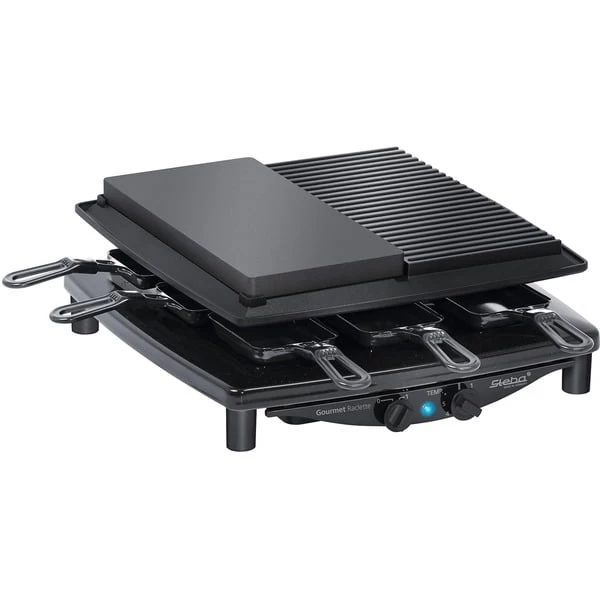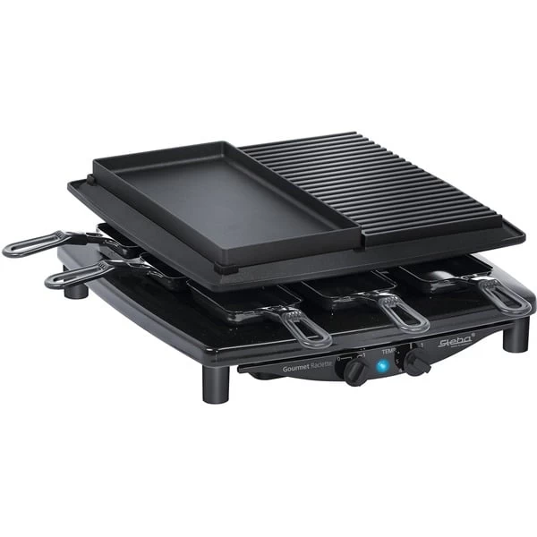 Das Raclette RC 4 Plus Deluxe hat ein Edelstahlgehäuse bietet Platz für acht Raclette-Pfännchen sowie zwei Grillplatten. Die Pfännchen sind emailliert, dadurch sind sie schneid- und kratzfest und können in der Spülmaschine gereinigt werden. Die Grillfläche beträgt insgesamt 29 cm x 29 cm und zum Zubereiten der verschiedensten Speisen stehen drei Grillplatten zur Auswahl, eine Antihaft-Druckguss-Grillplatte, eine Natursteingrillplatte und eine wendbare Gourmet-Guss-Pfanne mit glatter Fläche. An der Vorderseite des RC 4 Plus Deluxe befindet sich ein stufenloser Temperaturregler sowie ein Ein-/Ausschalter. Überschüssiges Fett und Bratenflüssigkeit läuft in eine dafür vorgesehene Auffangrille.Art.-Nr.: 1453982