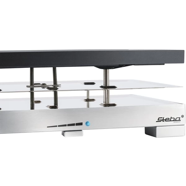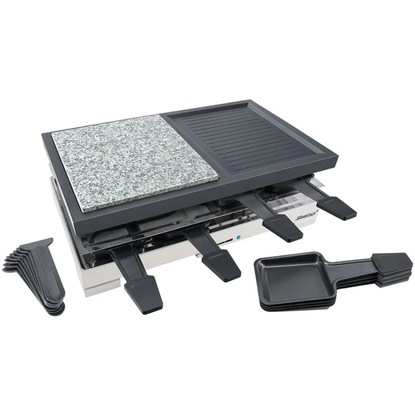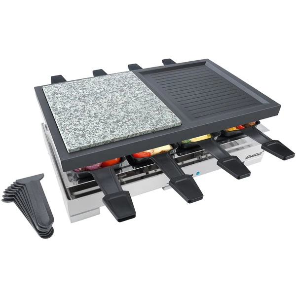 Das Raclette RC 88 hat ein elegantes, klares Design und bietet Platz für acht Raclette-Pfännchen. Die Pfännchen sind für leichte Reinigung antihaftbeschichtet. Die Grillfläche beträgt insgesamt 40 cm x 23,5 cm. Die antihaftbeschichtete Grillplatte aus Alu-Druckguß sorgt für gleichmäßige Wärmeverteilung und die hochwertige Natursteingrillplatte eignet sich optimal zum fettarmen Grillen. An der Vorderseite des RC 88 befindet sich ein stufenloser Temperaturregler mit Kontrollleuchte. Art.-Nr.: 1453987