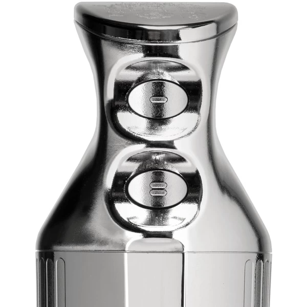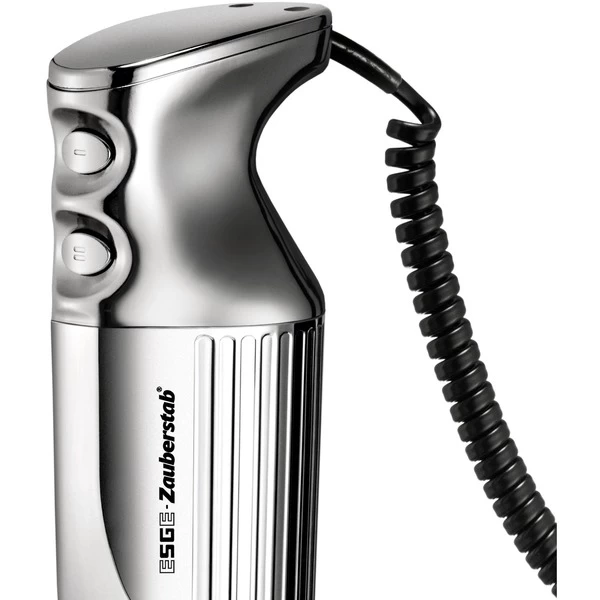 In Begleitung von reichlich Zubehör präsentiert sich der ESGE-Zauberstab M 200 Chrom in seinem stylishen Chrom-Outfit. Multimesser und Schlagscheibe können in der kompakten Zauberbasis aufbewahrt werden, in der der Zauberstab immer griffbereit ist. Paket umfasst auch den Zerkleinerer für Kräuter, Nüsse, Schokolade oder Parmesan. Serienmäßig gibt es außerdem eine Ablageschale aus Silikon für benutzte Kochutensilien dazu – und die praktische Reinigungsbürste, mit der die Aufsteckteile im Nu gesäubert werden können. Durch den Sicherheits-Twinschalter stehen wahlweise 12.000 oder 17.000 Umdrehungen pro Minute zur Verfügung – für den langlebigen, robusten AC-Motor „Made in Switzerland“ kein Problem. Mobil und bequem ist der ESGE Zauberstab durch das bis zu 150 Zentimetern ausziehbaren Spiralkabel und die Aufsteckzentrierung, die das Aufstecken der Zubehörteile ganz einfach macht.Art.-Nr.: 1670959
