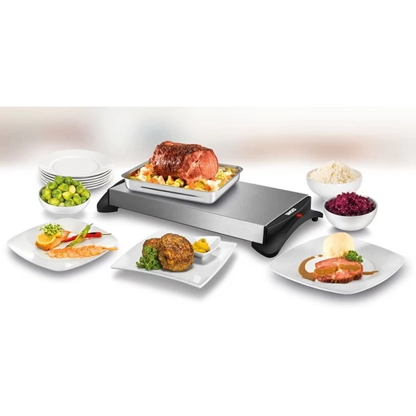 Die Unold Warmhalteplatte hält Speisen servierfertig warm. Die Wärmespeicherplatte mit Keramikkern ist in circa fünf Minuten einsatzbereit. Von circa 30 bis 110 Grad gibt sie Wärme kontrolliert an Teller, Tassen und Terrinen ab und dies bis zu einer Stunde lang. Zu heiß werden oder gar anbrennen kann nichts, denn der Überhitzungsschutz schaltet automatisch ab einer bestimmten Temperatur ab. Dank der Cool-Touch-Griffe kann man jederzeit die Platte gefahrlos Anheben und Transportieren. Und keine Angst vor Kabelsalat auf dem Esstisch, nach dem Erwärmen der Unold Warmhalteplatte verschwindet das Kabel ruckzuck vom Tisch.Art.-Nr.: 951682